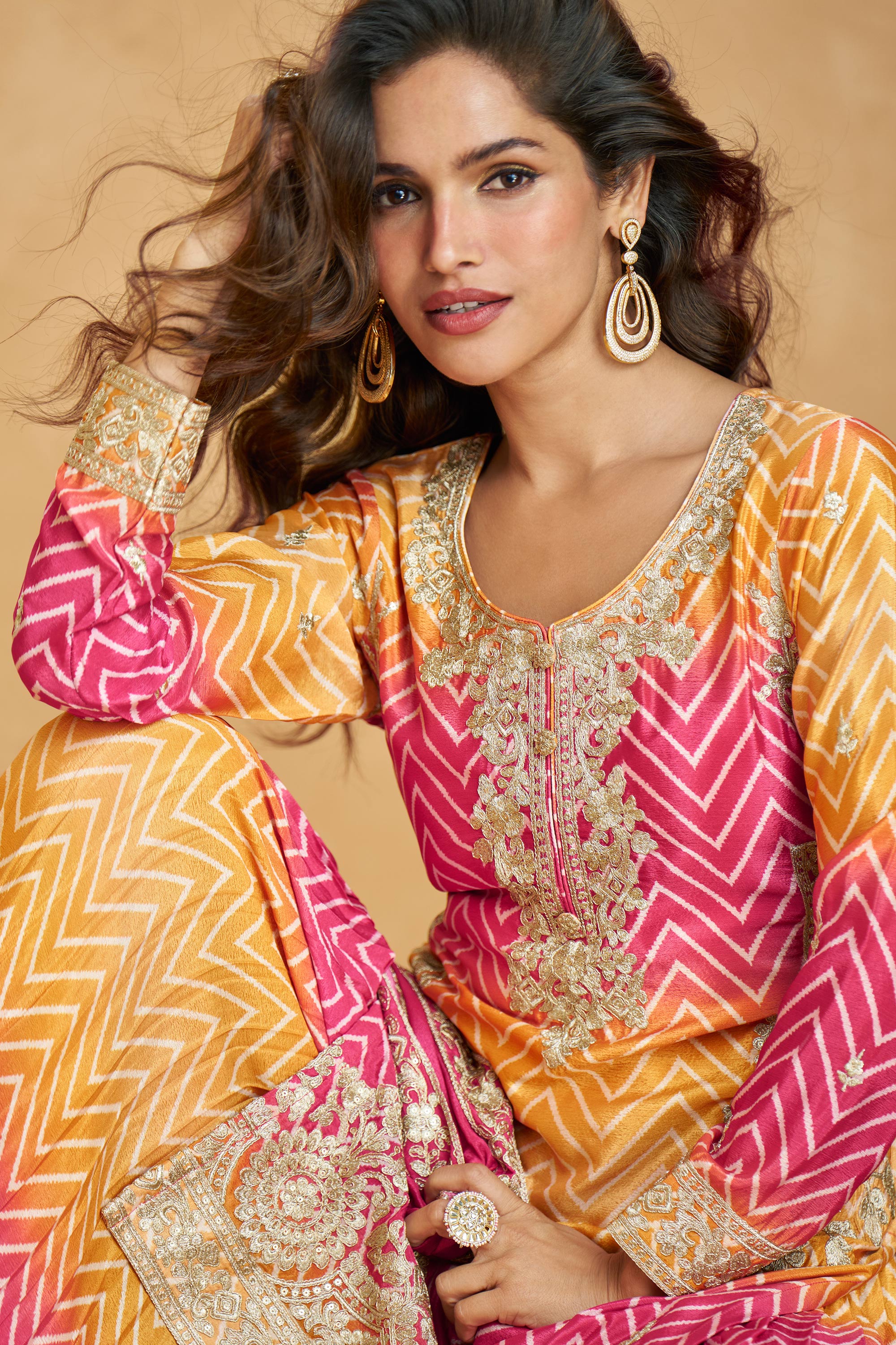 Embroidered Chinon Silk Peach Readymade Palazzo Suit With Dupatta For Festive Wear