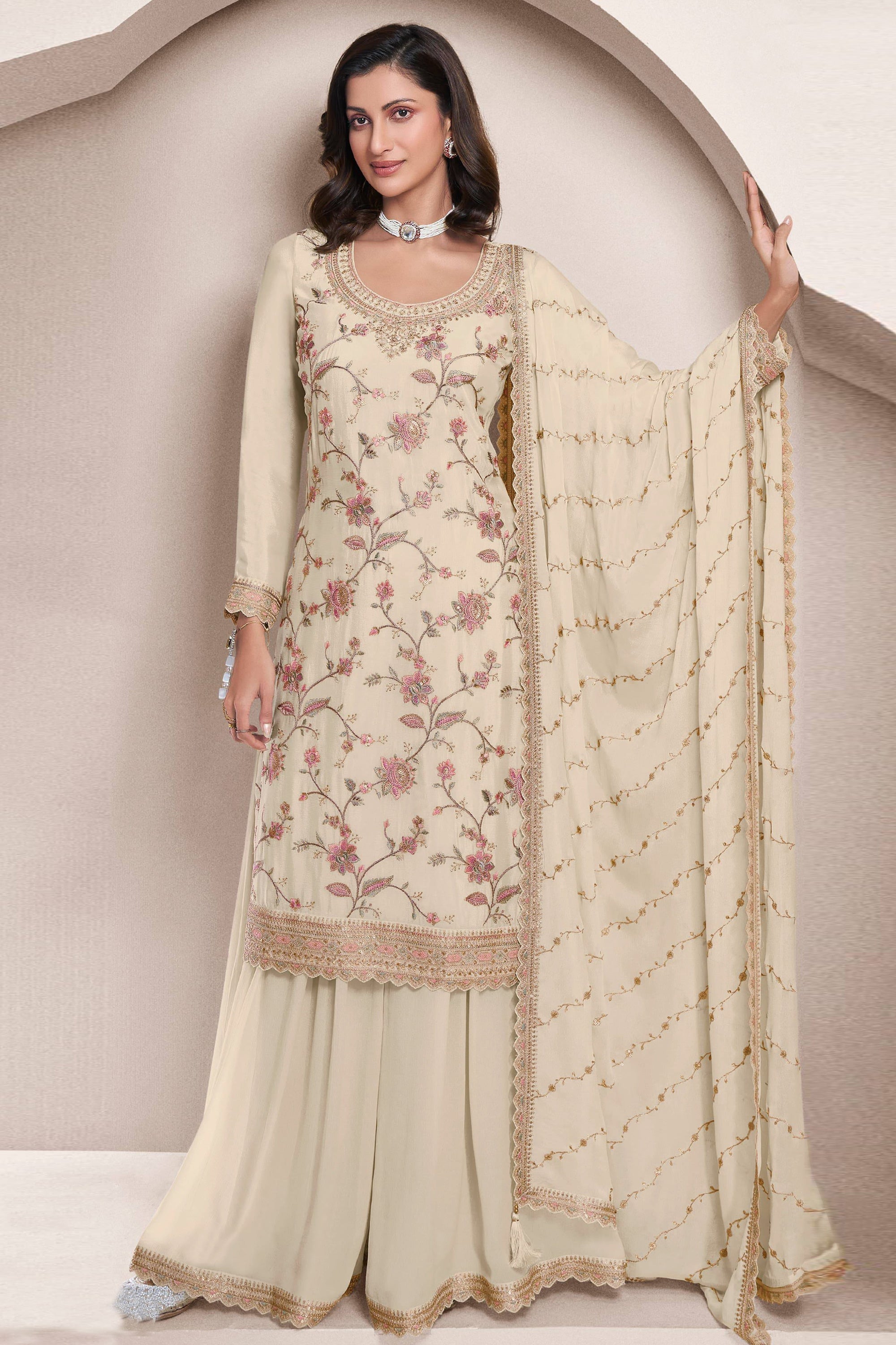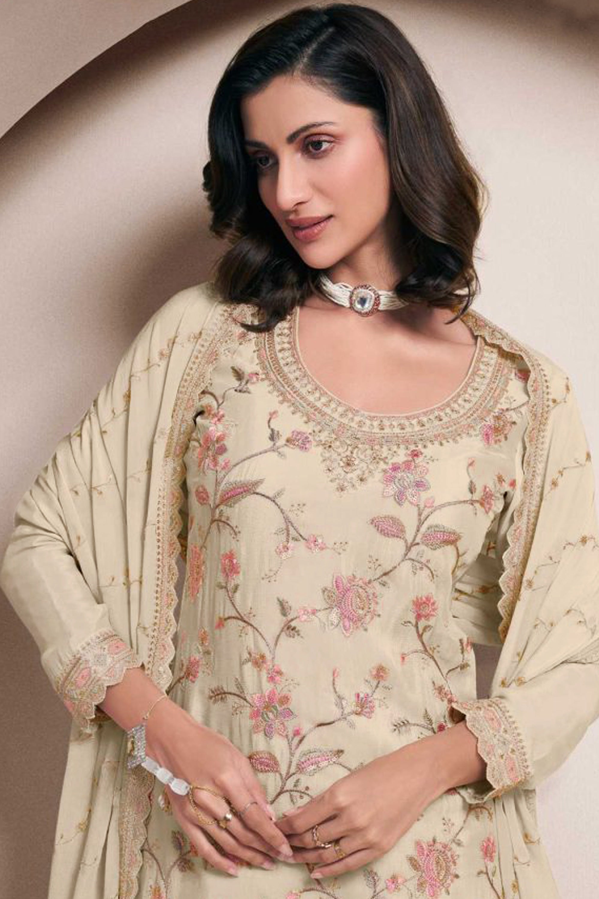 Designer Chinon Beige Palazzo Suit With Embroidered Work