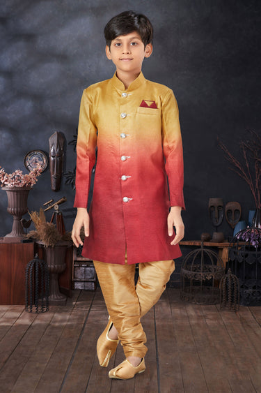 Reach Color Traditional Wear Readymade Indo Western For Boys - Dress your little prince in this exquisite Indo Western outfit, ideal for various celebrations. This traditional wear combines vibrant colors and beautiful designs to create an outfit that's both stylish and comfortable. Crafted with care from high-quality materials, it ensures a soft and breathable experience for your child. This ready-to-wear set is perfect for festivals, wedding ceremonies, and other special events. Available in a range of sizes to fit boys of different ages.