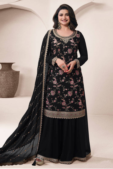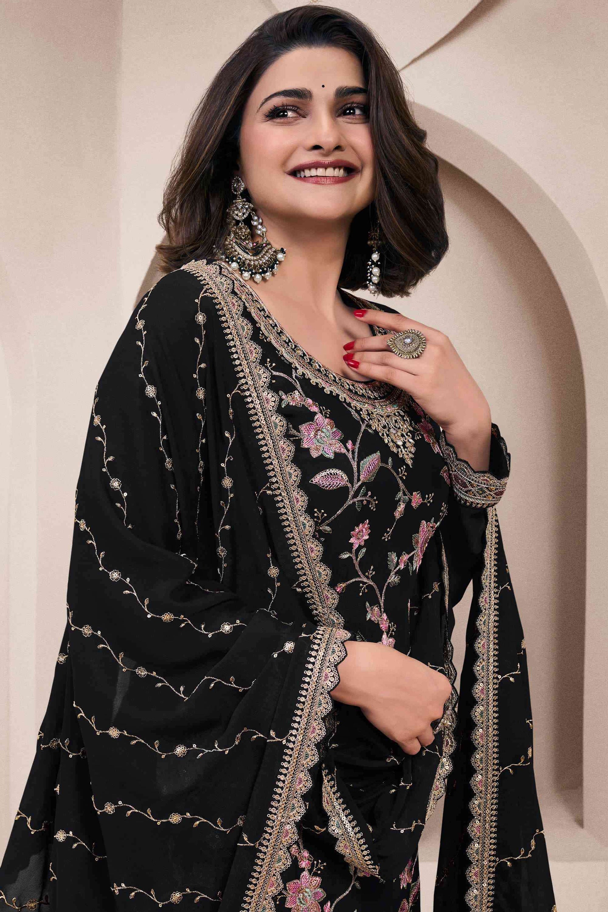 Prachi Desai Black Chinon Embroidered Work Palazzo Suit For Festive Wear