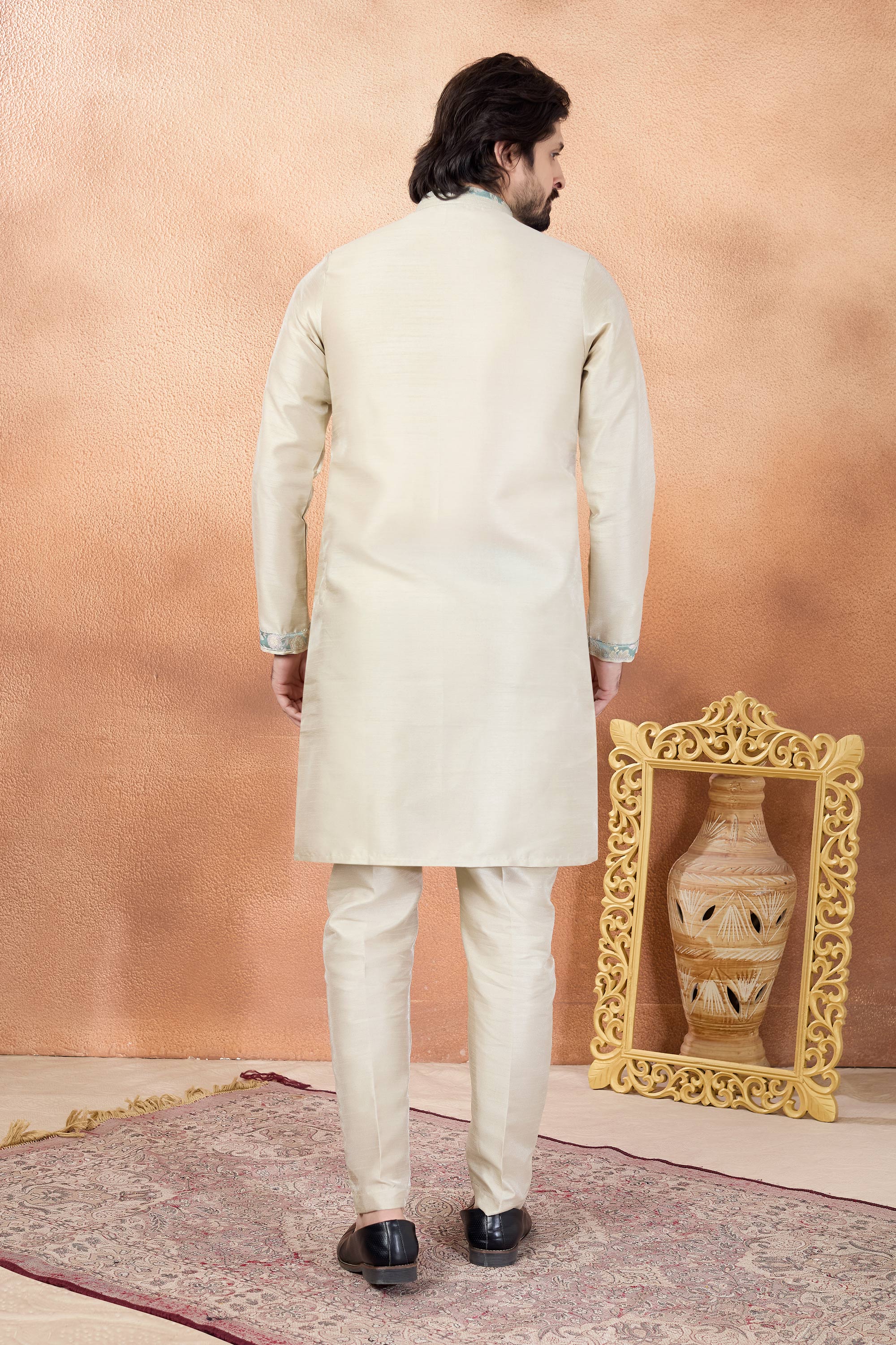 Add a touch of festive grandeur to your wardrobe with this Mens Kurta and Aligadhi Pant Set. Crafted from smooth art silk and rich art Banarasi silk, this ensemble is designed for comfort and style during celebrations, while slight color variations may occur due to digital photography.