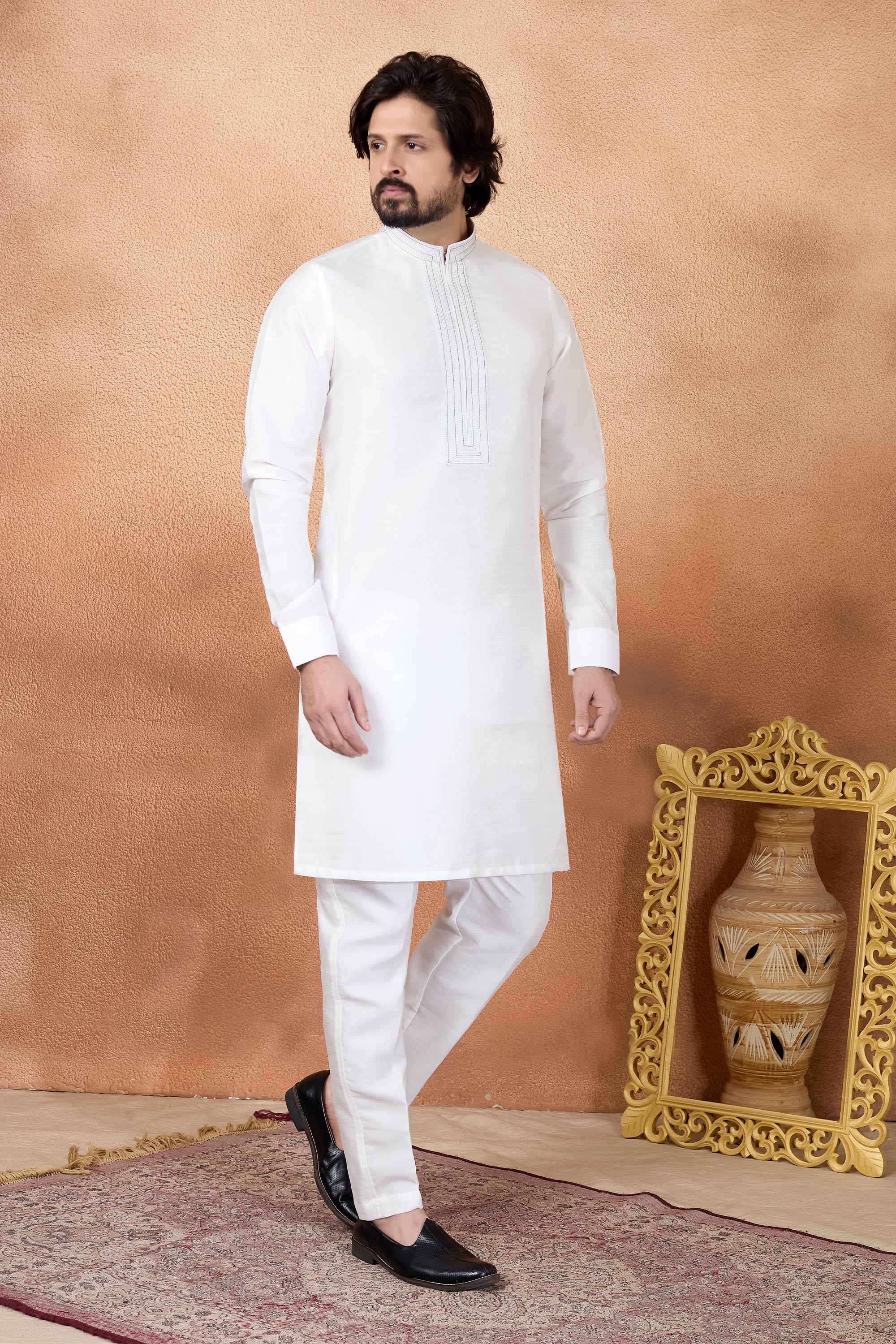 Step into timeless tradition with this Mens Kurta and Aligadhi Pant Ensemble, designed for graceful festive appearances. The art silk straight kurta offers a sleek silhouette, paired beautifully with an art Banarasi silk Aligadhi pant, creating a balanced blend of comfort and sophistication, while slight color variations may occur due to digital photography.