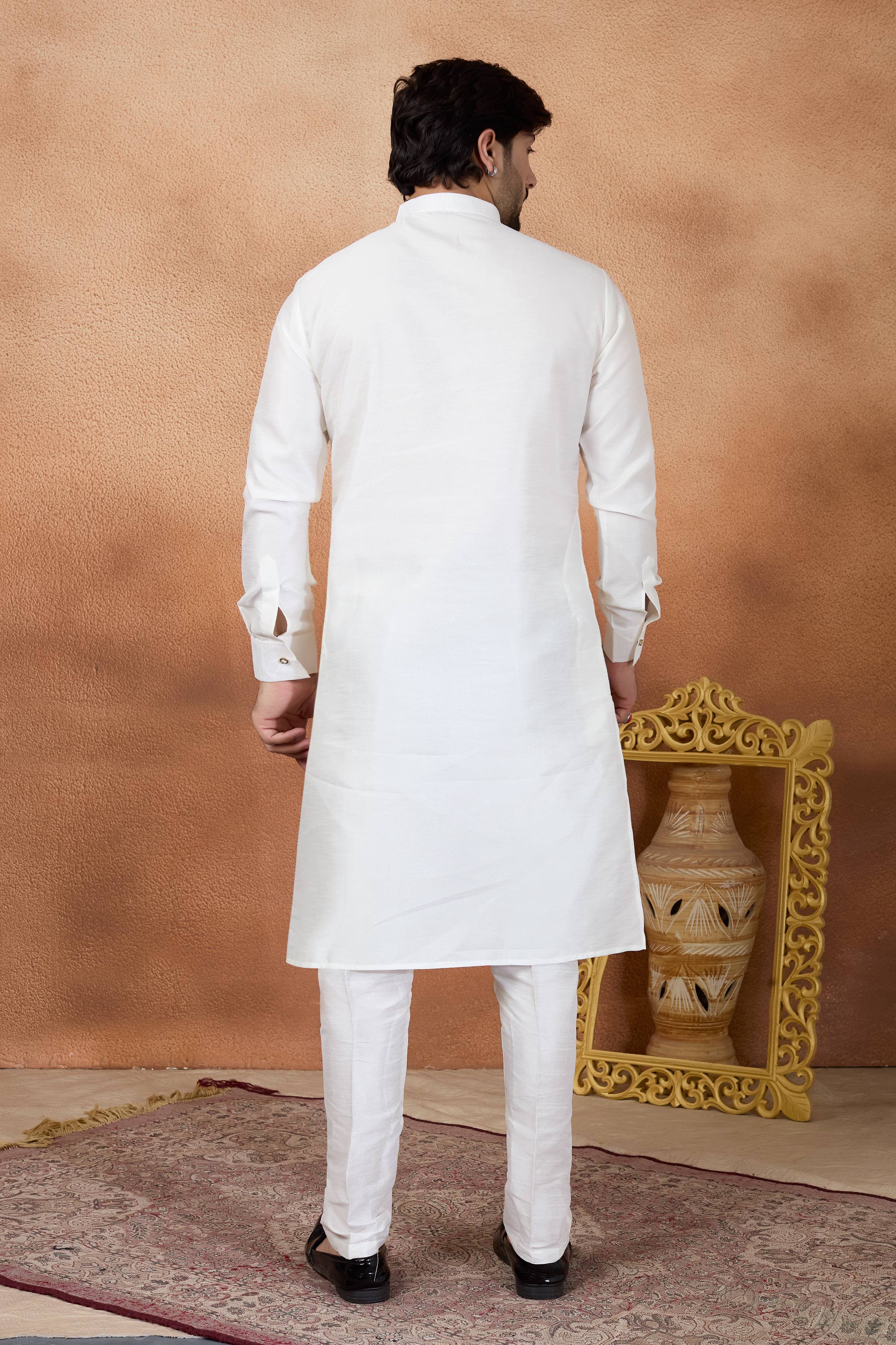 Add a touch of festive grandeur to your wardrobe with this Mens Kurta and Aligadhi Pant Set. Crafted from smooth art silk and rich art Banarasi silk, this ensemble is designed for comfort and style during celebrations, while slight color variations may occur due to digital photography.