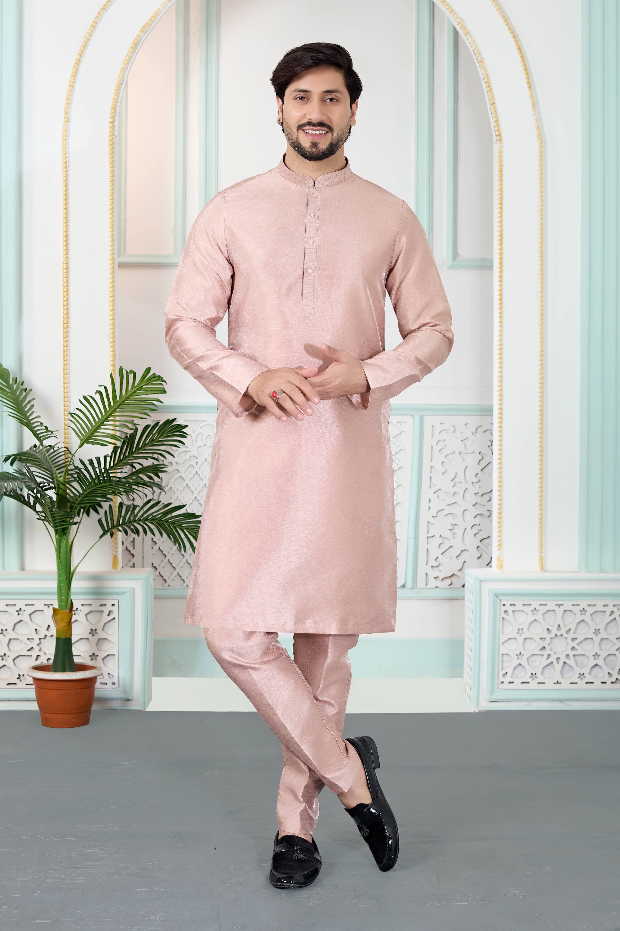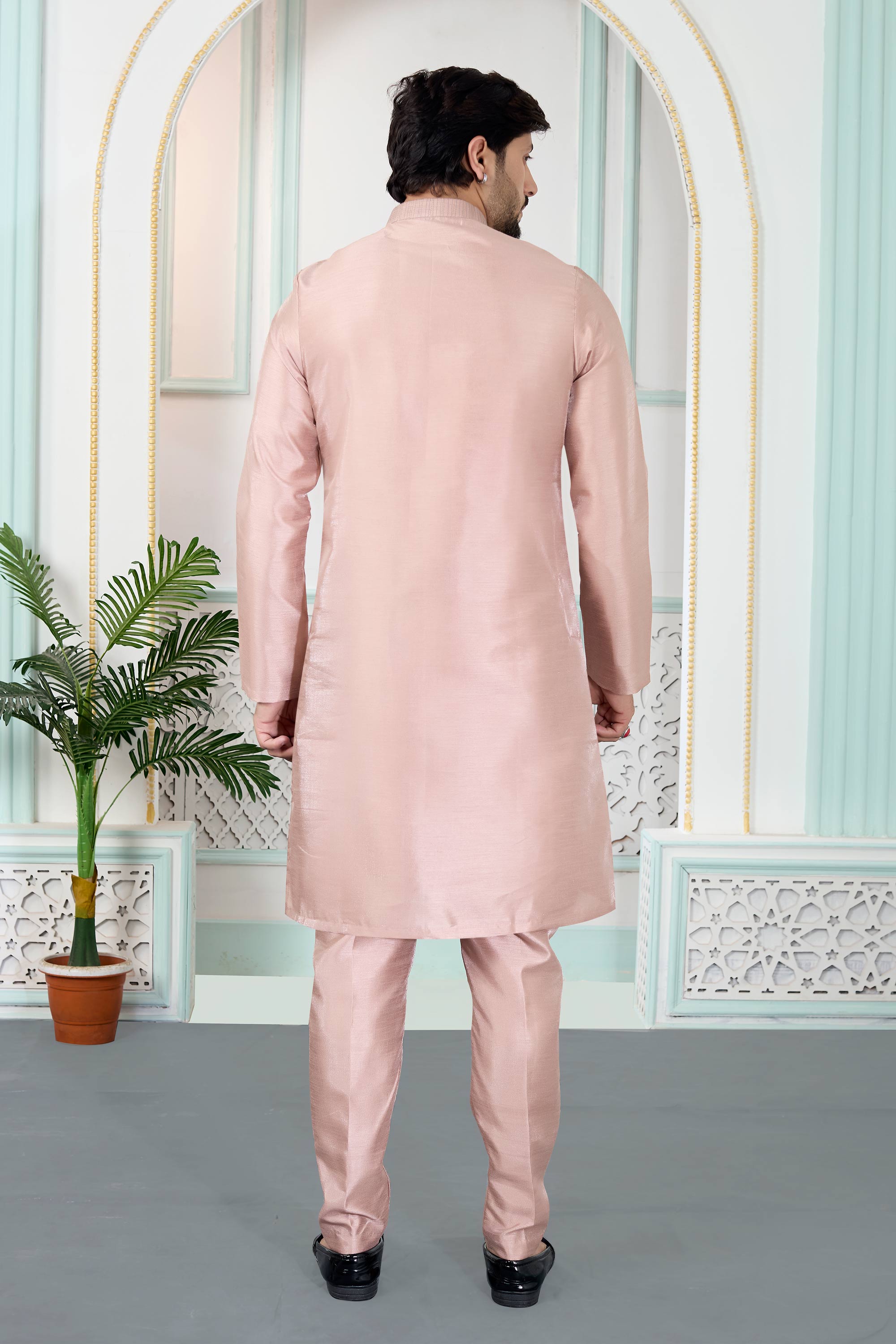 Pink Function Wear Art Silk Readymade Kurta Pyjama For Men