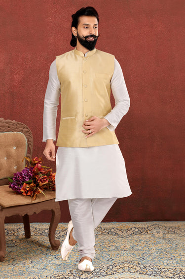 White Dhupion Silk Fabric Festive Wear Readymade Kurta Pyjama For Men With Jacket