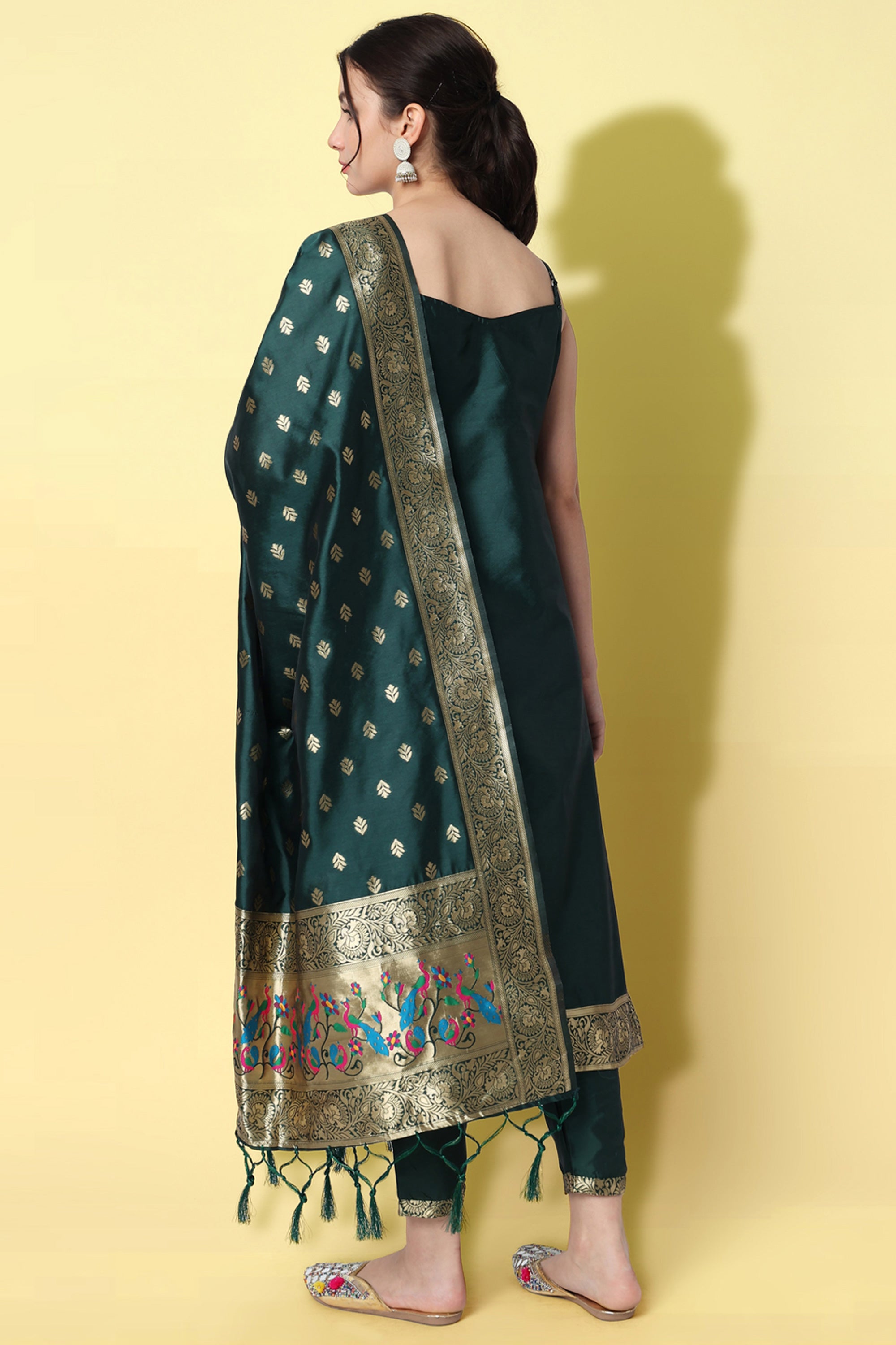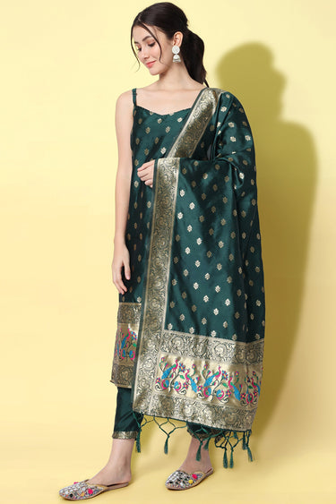 Attractive Dark Green Jacquard Silk Weaving Work Salwar Suit With Banarasi Silk Dupatta