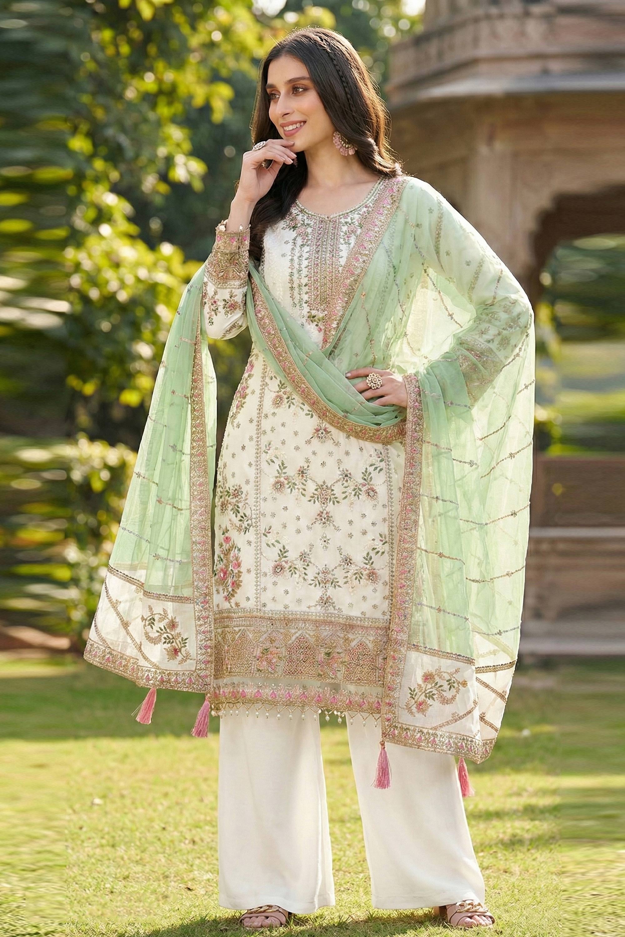 Add effortless elegance to your ethnic collection with this Designer Salwar Kameez Unstitch Outfit. Crafted with a finely embroidered georgette top, paired with a comfortable dull santoon bottom and a matching georgette dupatta, this ensemble offers a graceful and refined look. Ideal for festivals, functions, and special occasions. Note: Due to digital photography, slight color variations may occur.