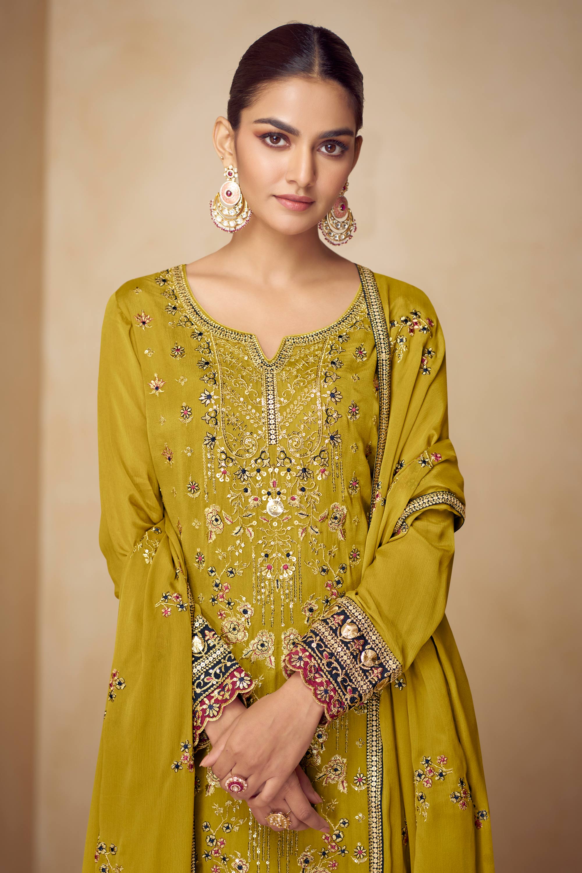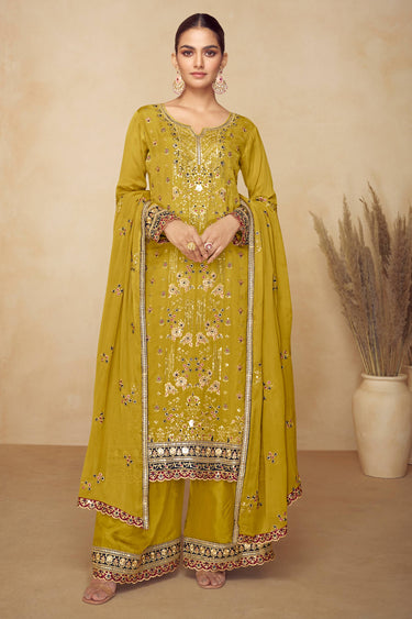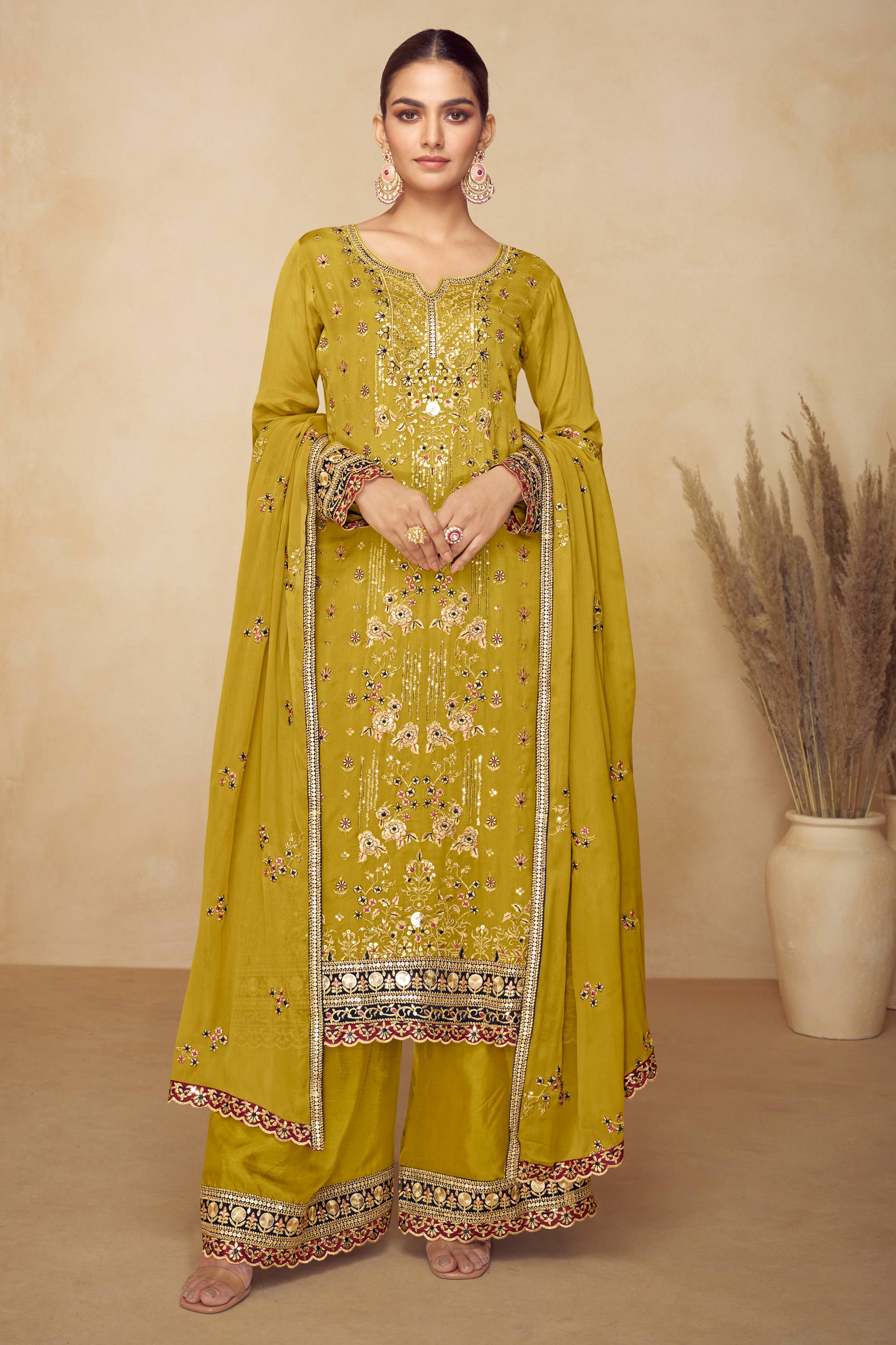 Mustard Color Chinon Embroidered Readymade Palazzo Suit