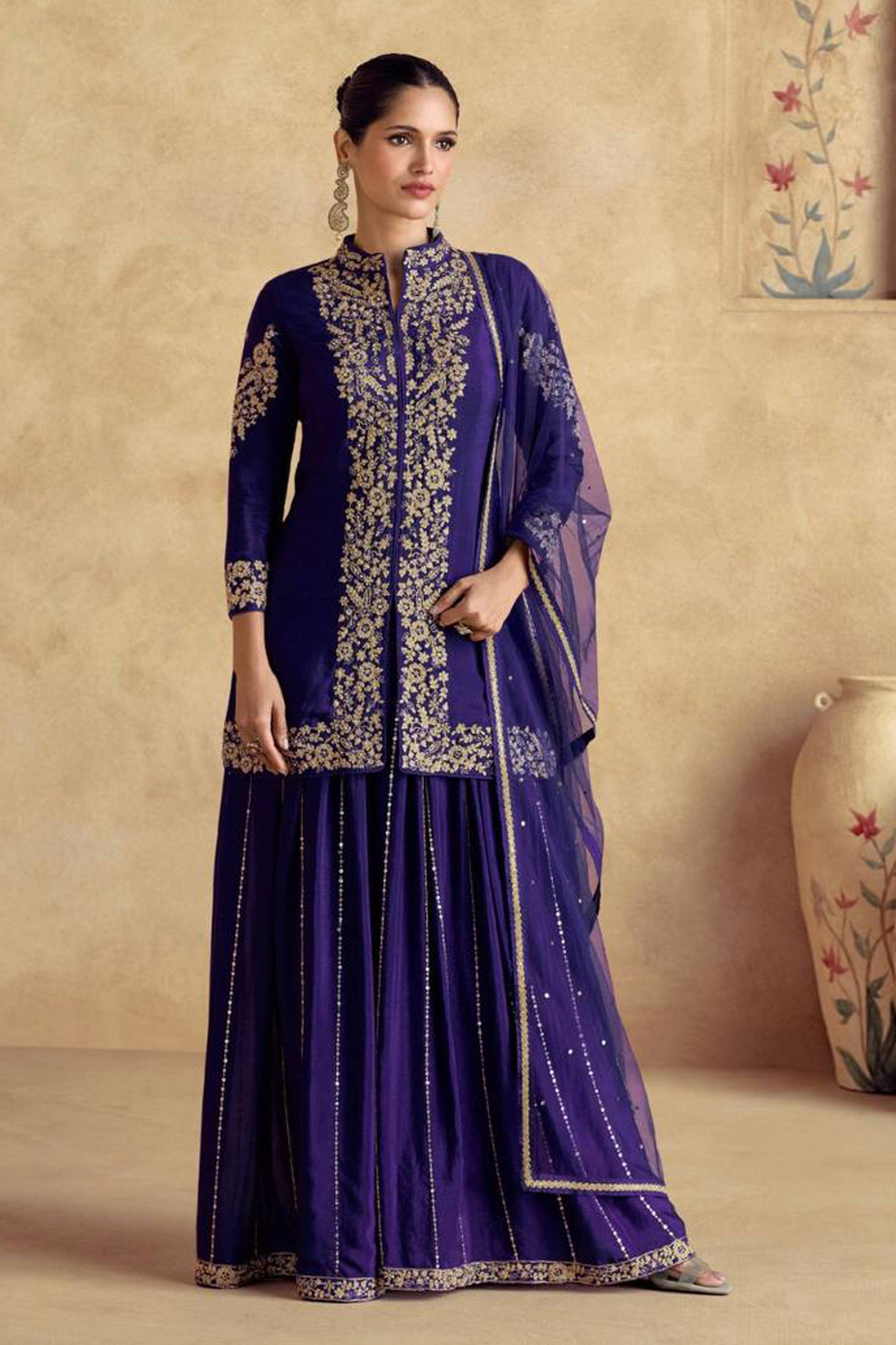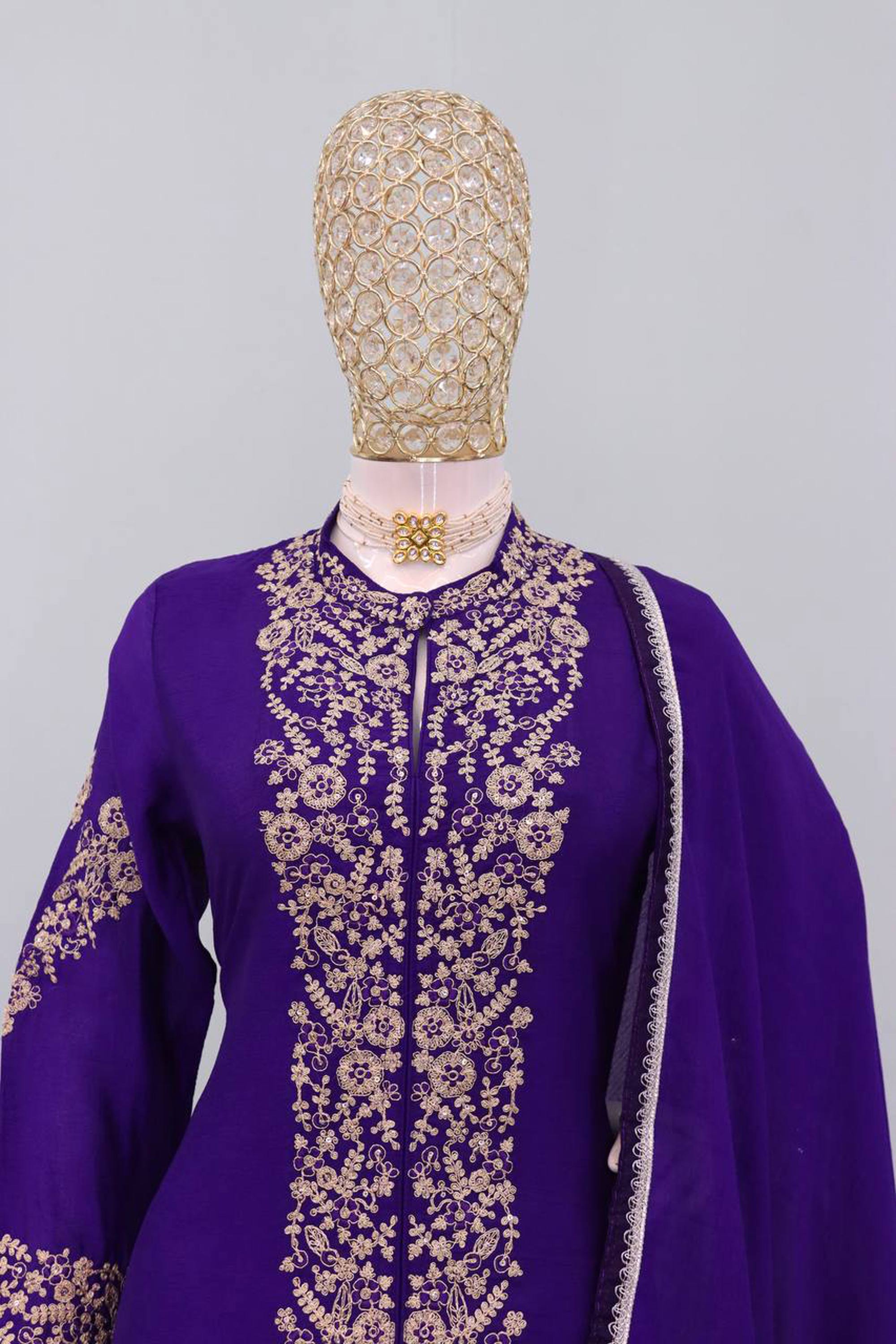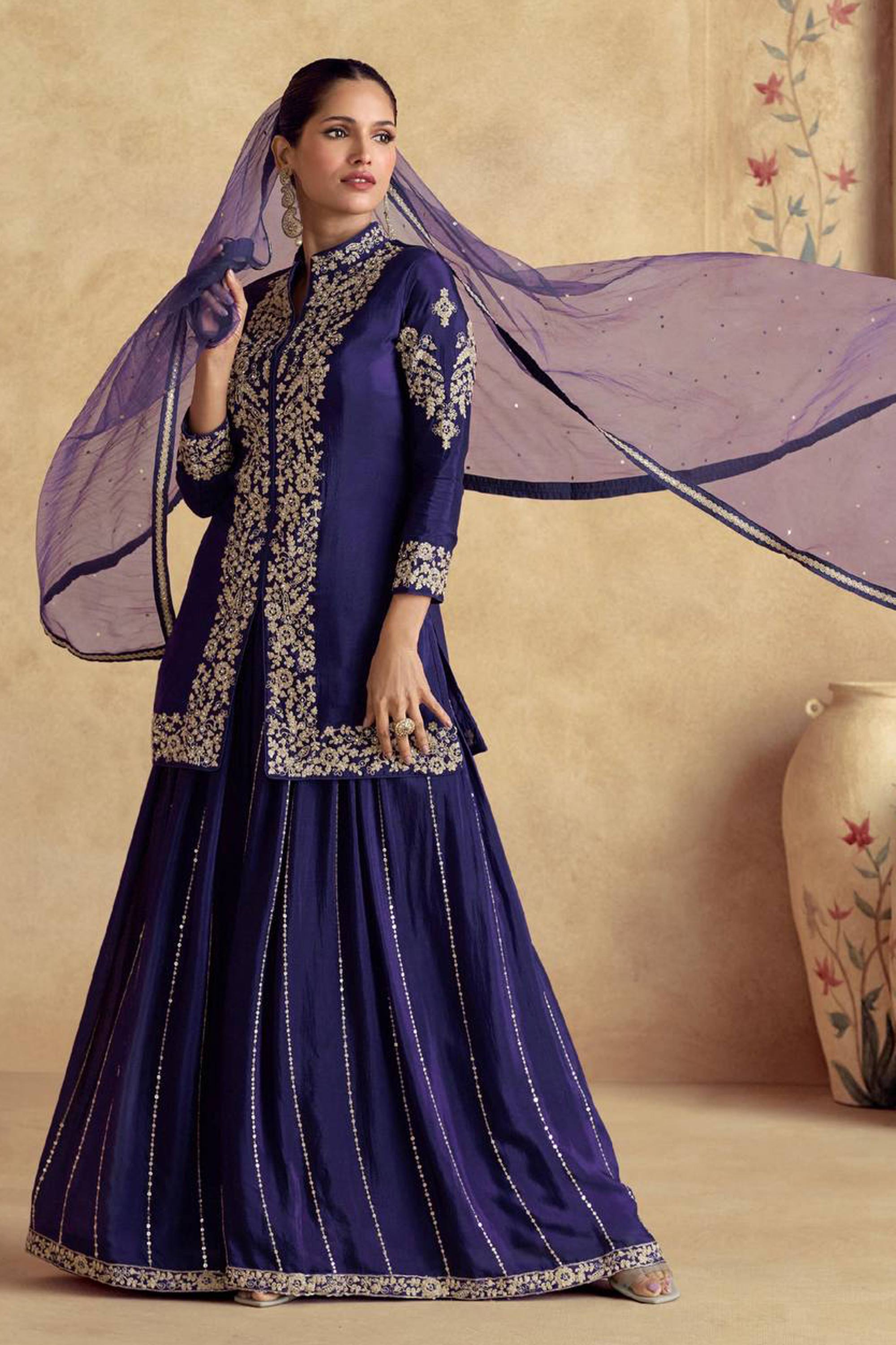 Navy Blue Festive Wear Embroidered Chinon Readymade Palazzo Suit