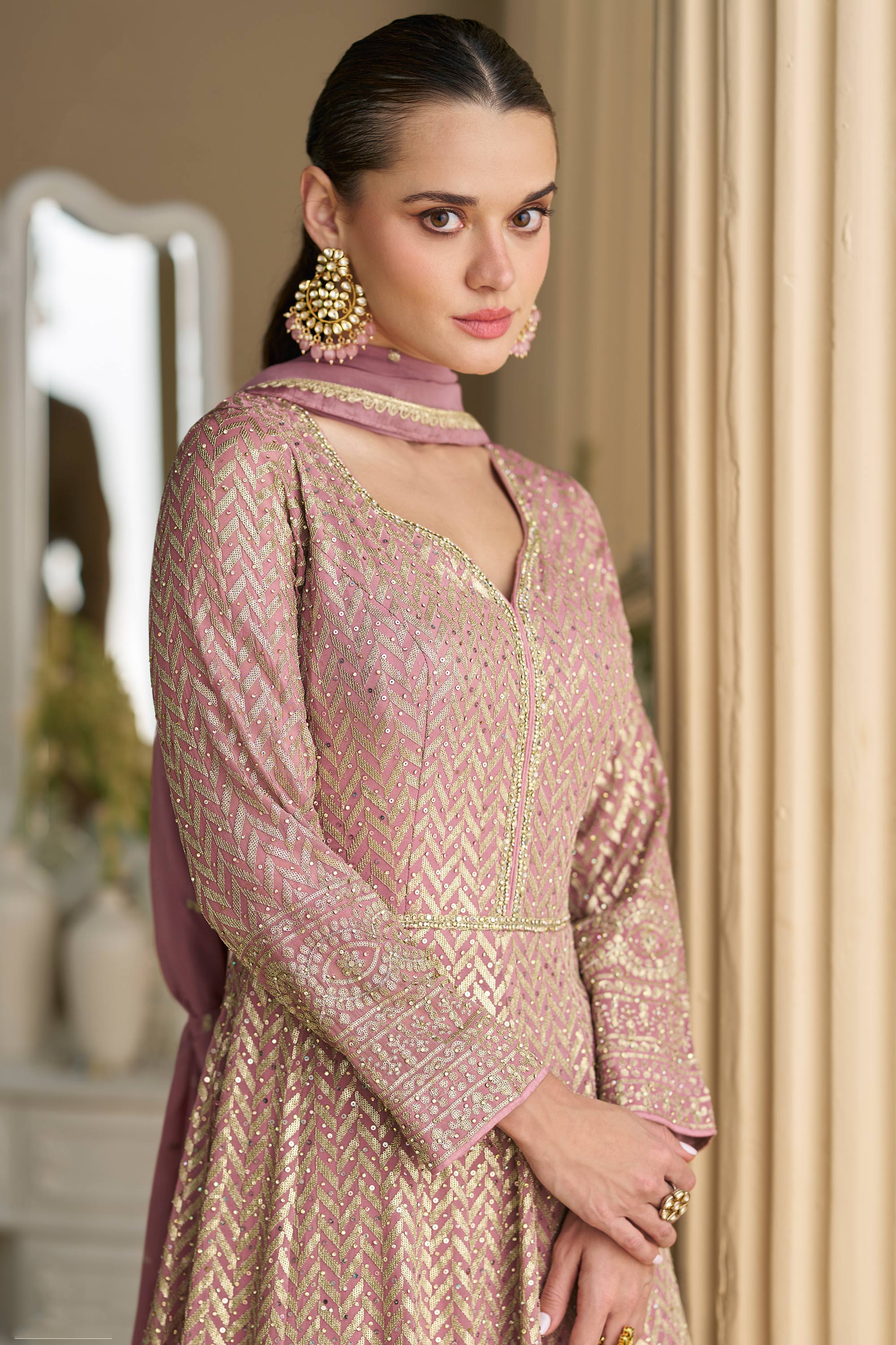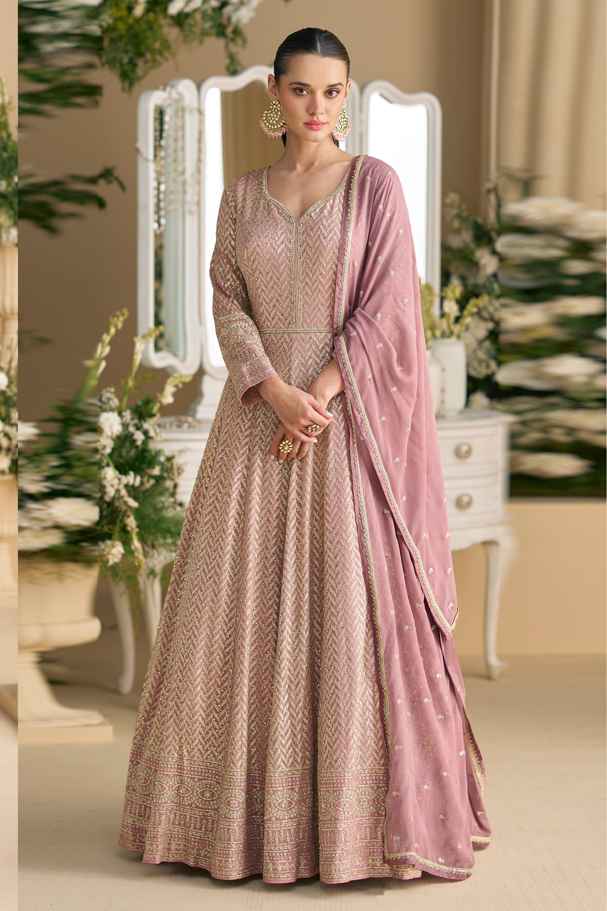 Embroidered Georgette Readymade Gown In Pink Color