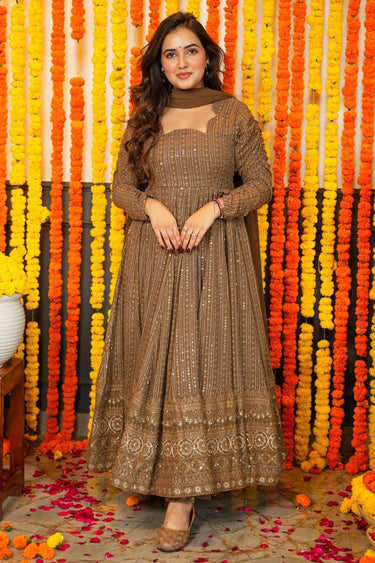 Georgette Fabric Sequins Design Brown Color Riveting Gown With Dupatta