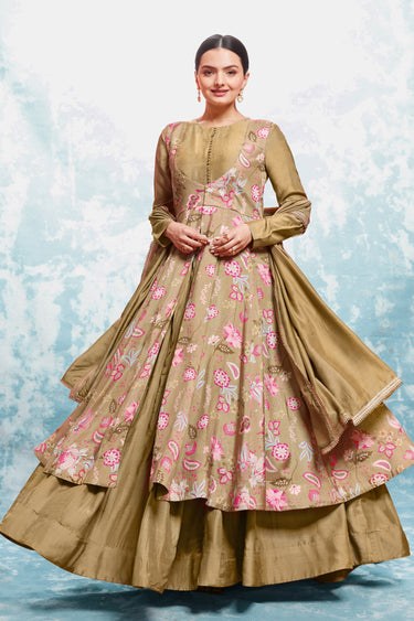 Muslin Fabric Beige Color Gorgeous Look Readymade Gown WIth Dupatta