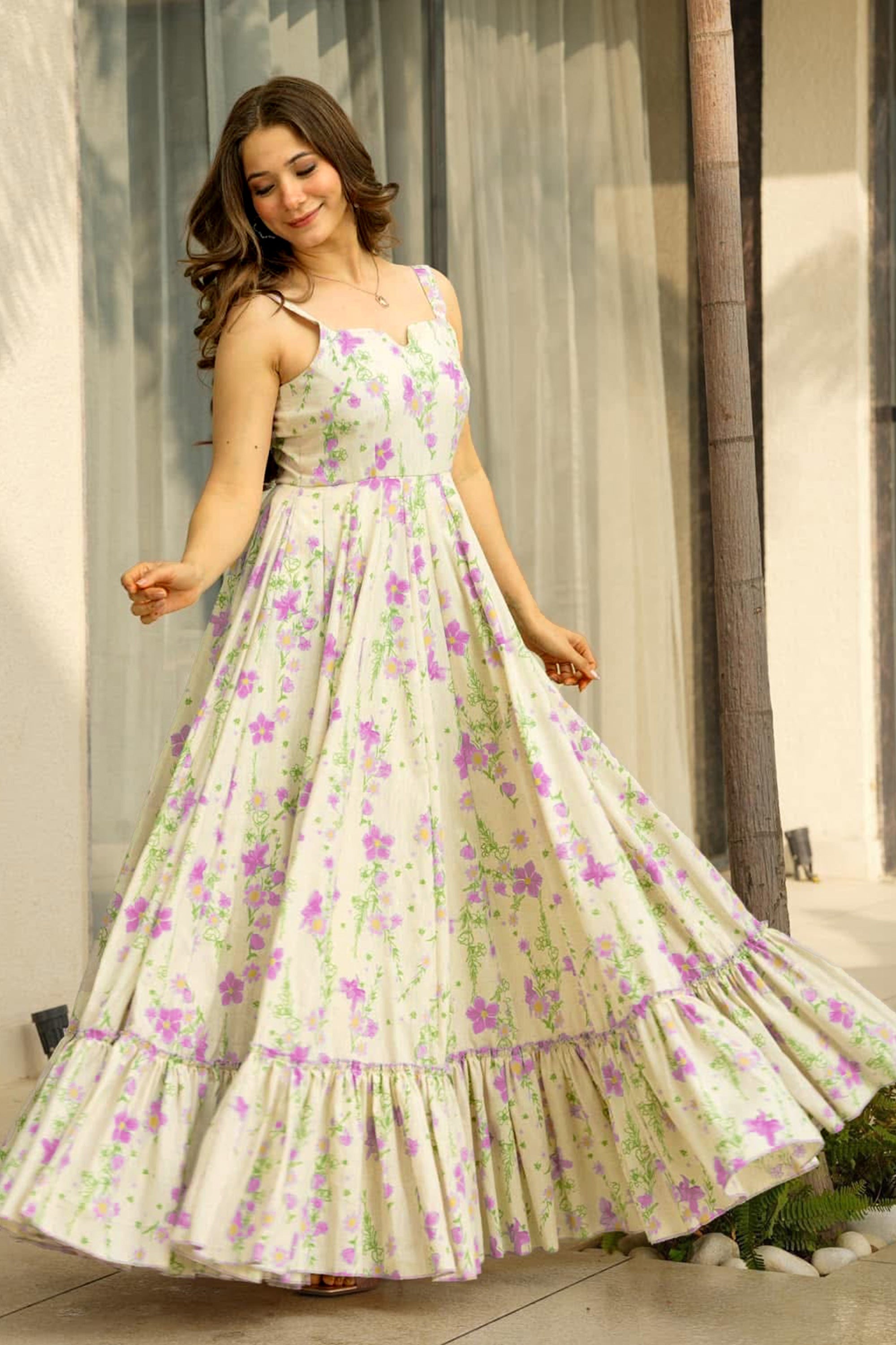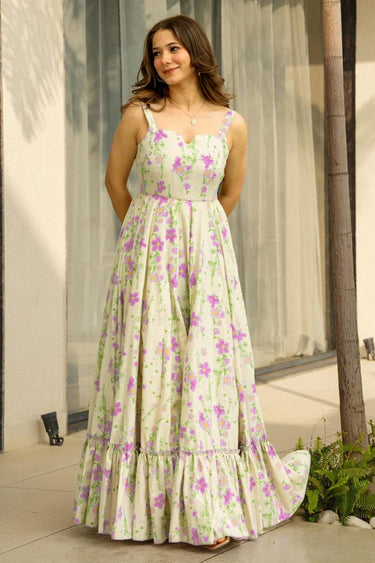 Off White Digital Printed Floor Touch Readymade Anarkali Style Gown