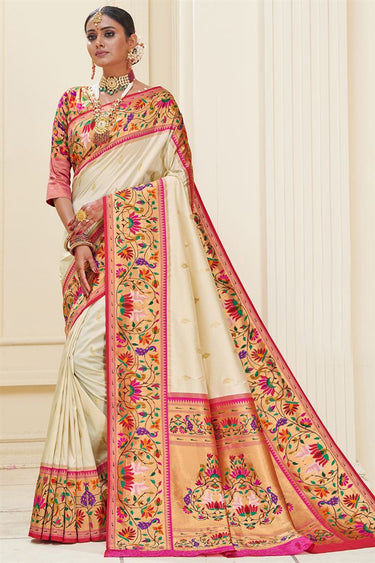 Beige Color Pure Paithani Silk Fabric Designer Weaving Work Function Wear Saree