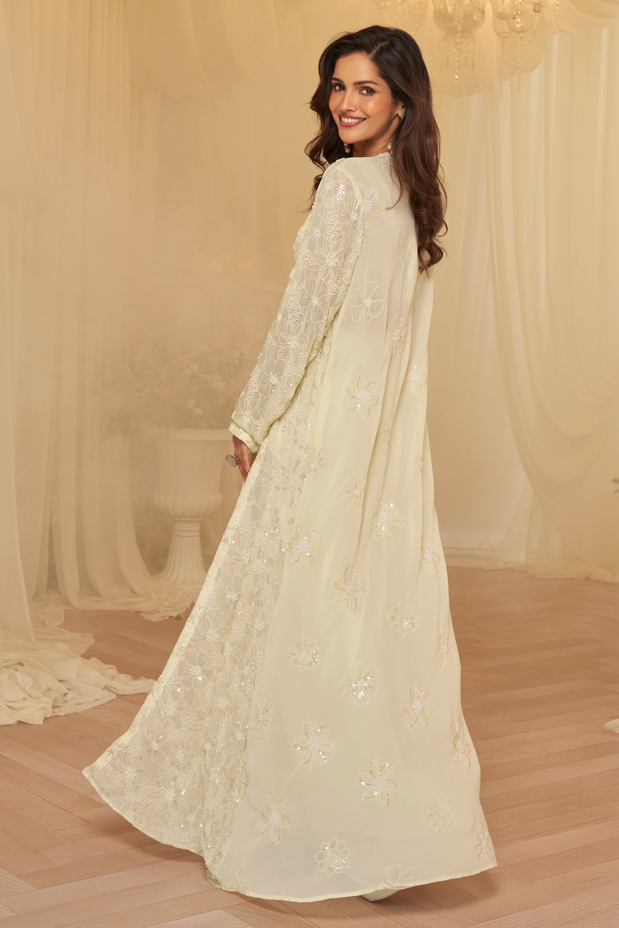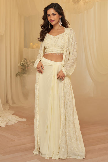 Designer Cream Georgette Embroidered Indo Western Palazzo With Crop Top And Long Jacket