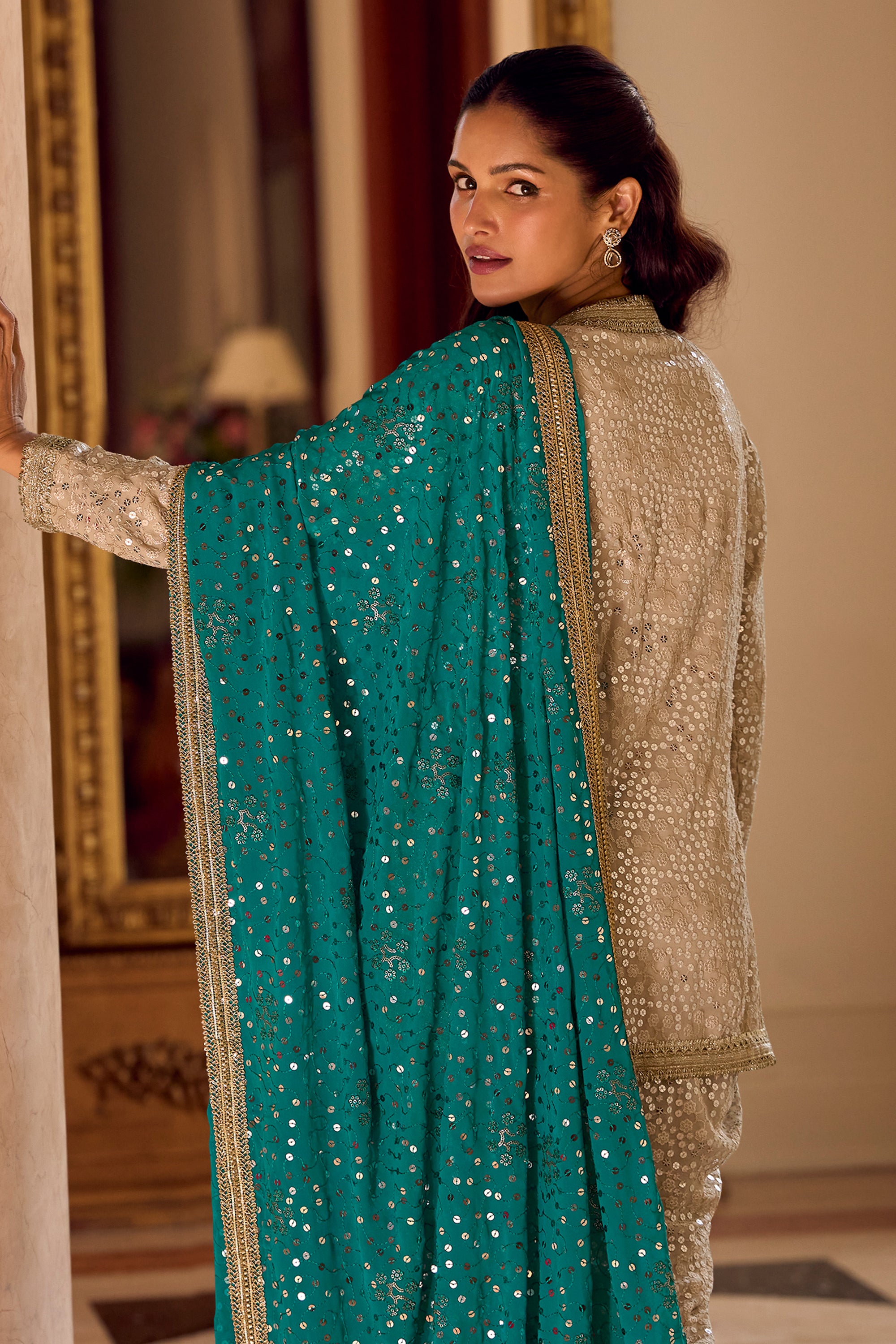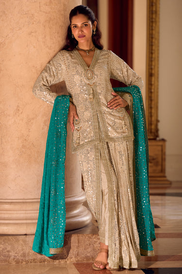 Georgette Beige Indo Western Readymade Top With Dhoti Style Bottom
