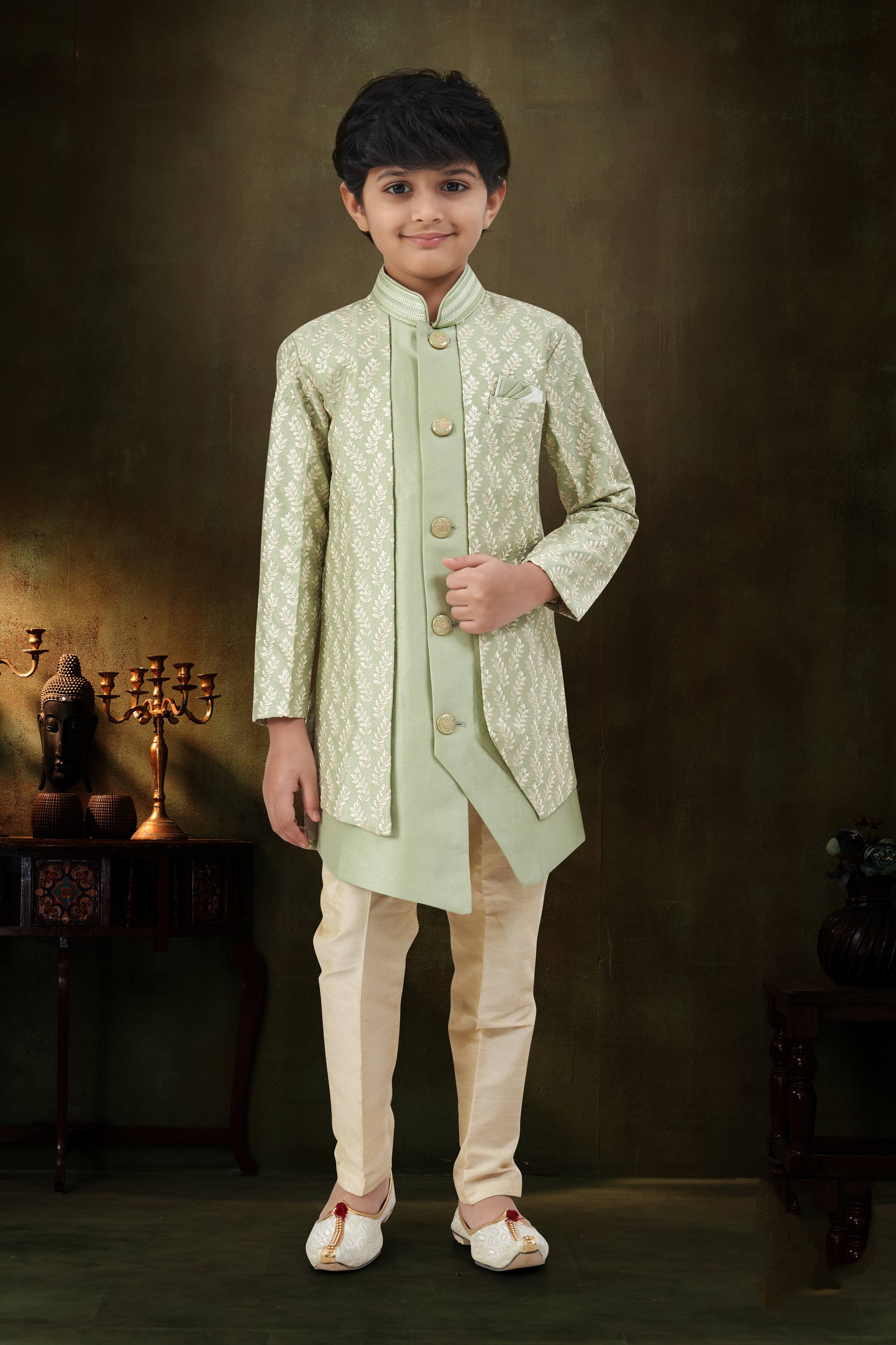 Sea Green Festive Wear Art Silk Fabric Readymade Indo Western For Boys