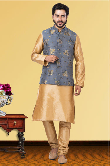 Dhupion Raw Silk Fabric Cream Festive Wear Readymade Men Stylish Kurta Pyjama With Jacket