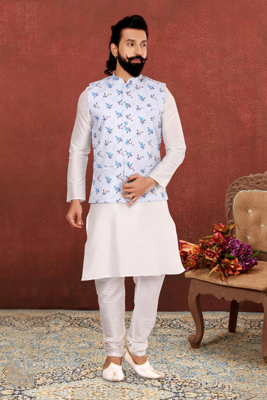 Dhupion Silk White Color Wedding Wear Readymade Designer Men Kurta Pyjama With Jacket
