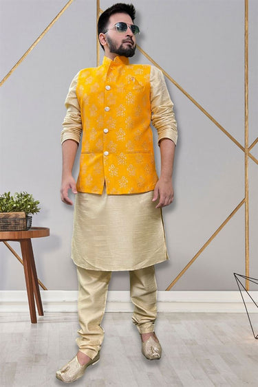 Moss Art Silk Fabric Readymade Men Kurta Pyjama With Yellow Color Jacket Set