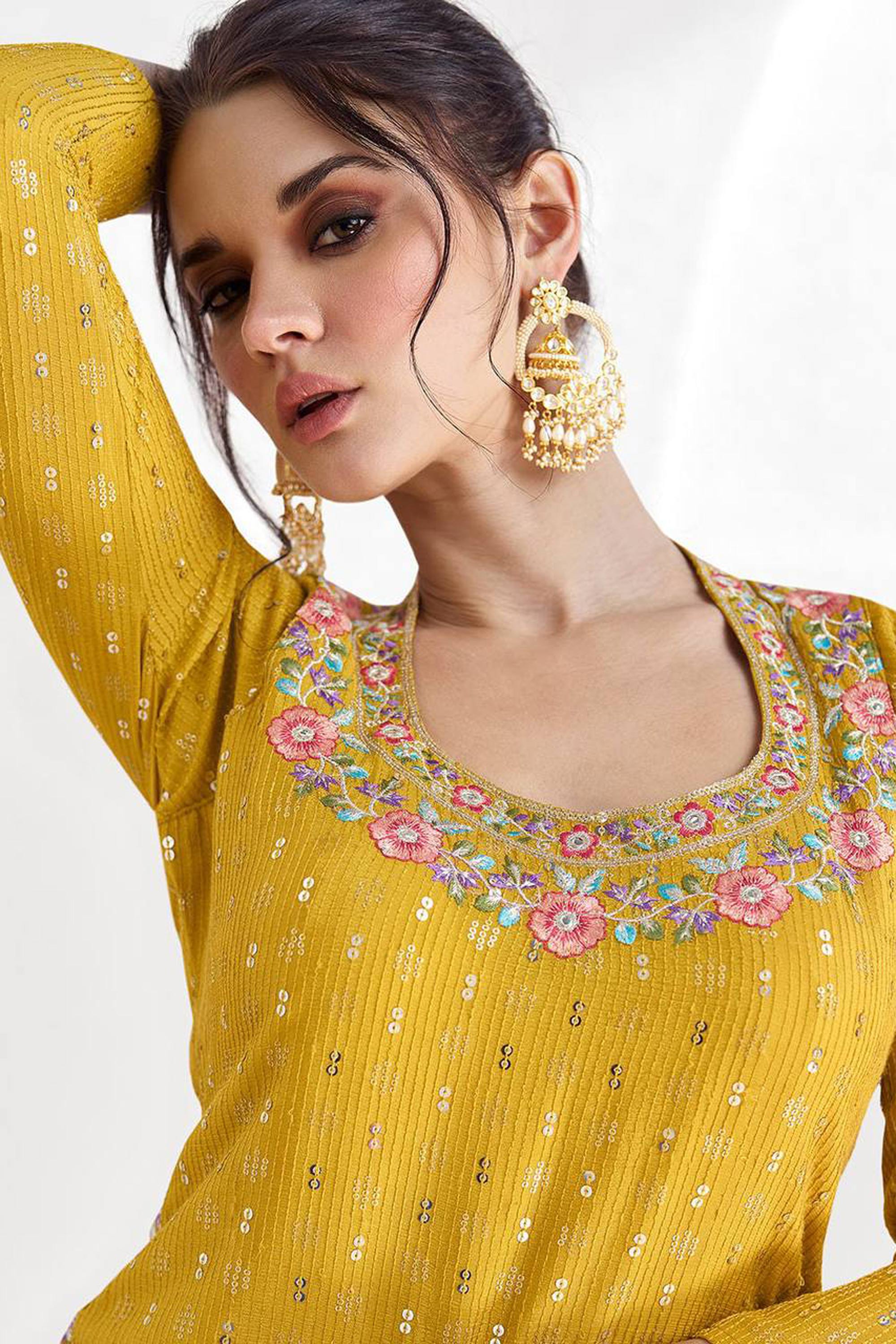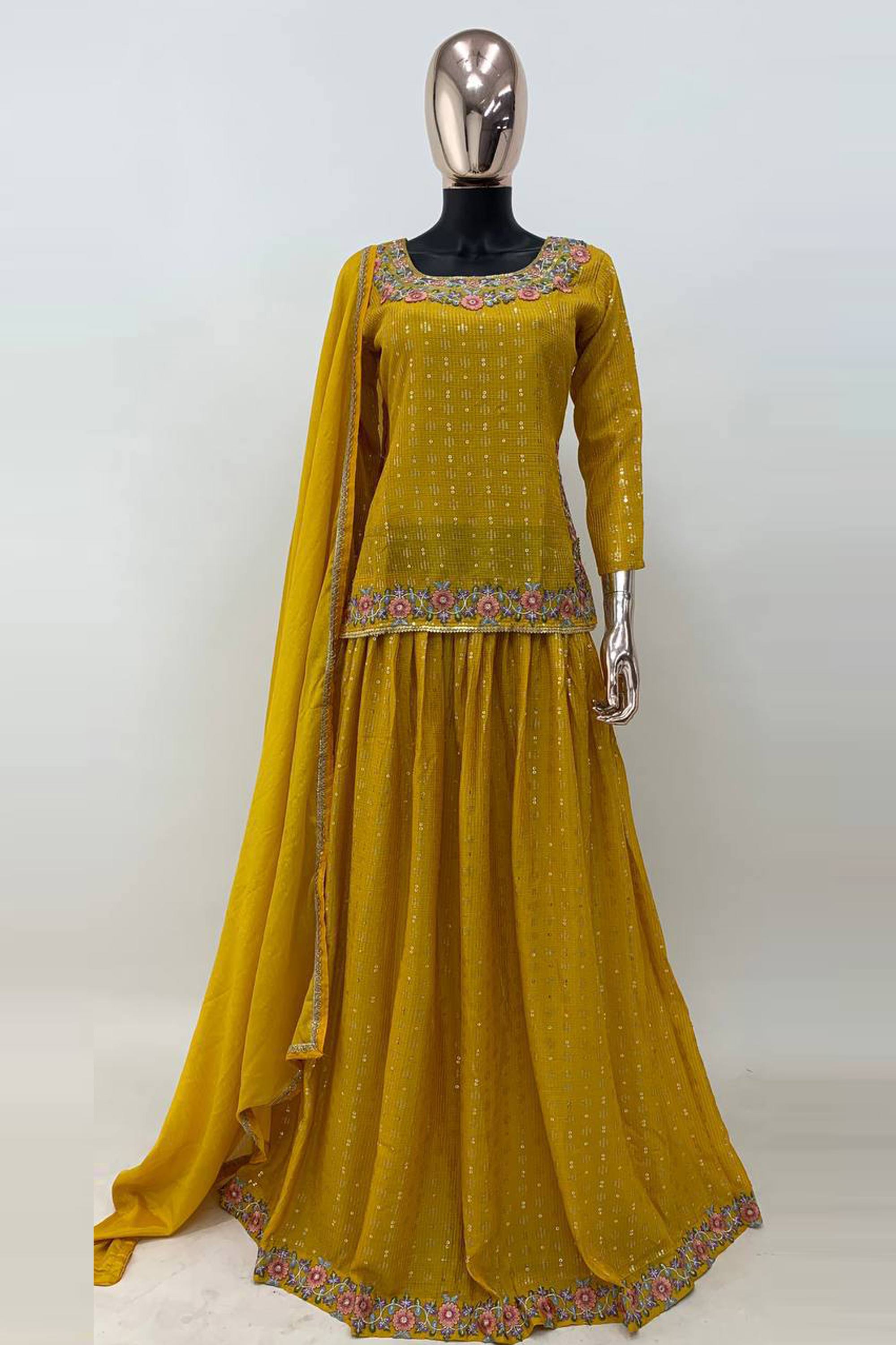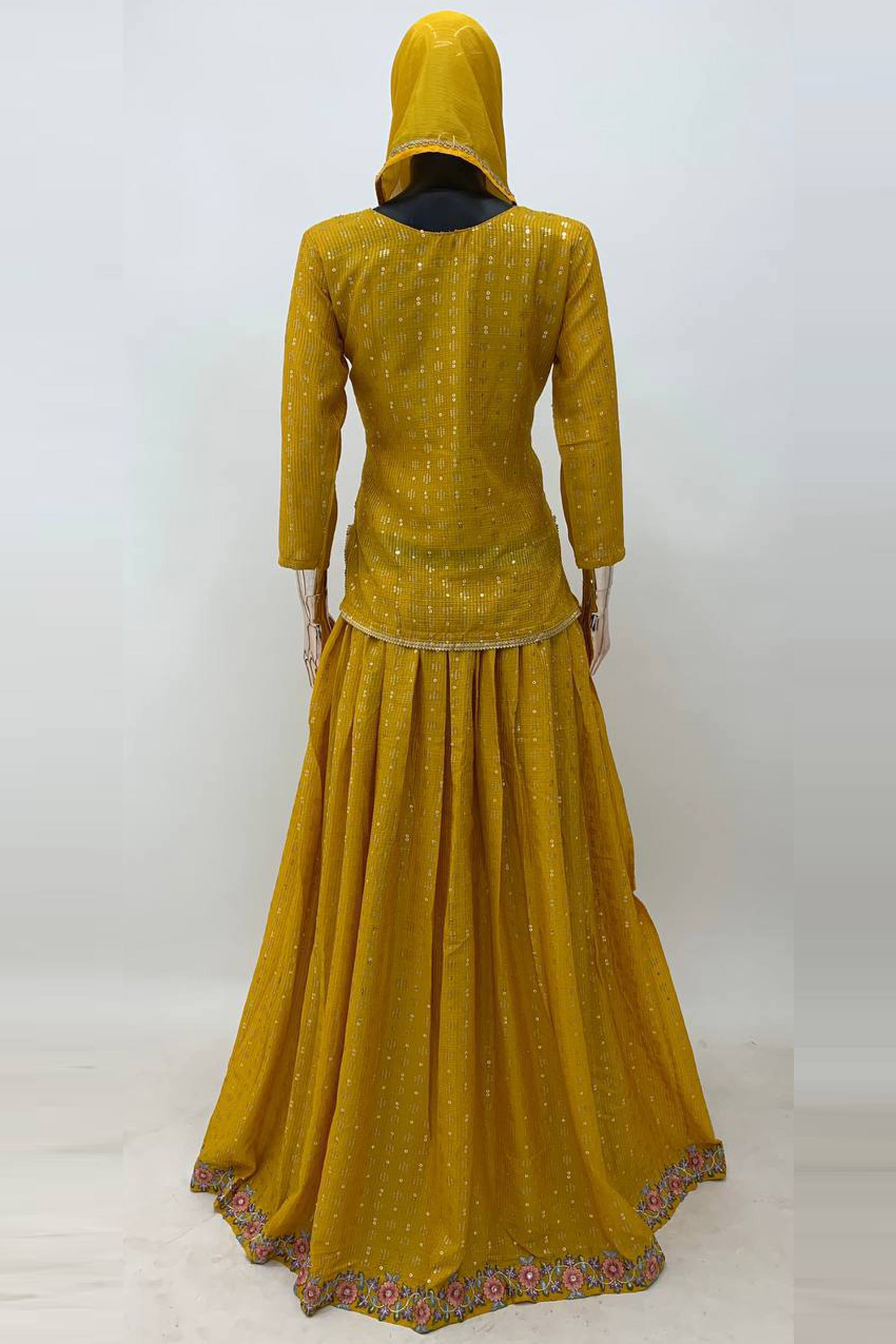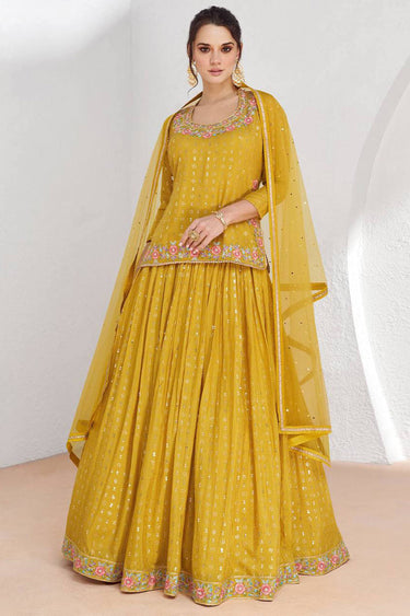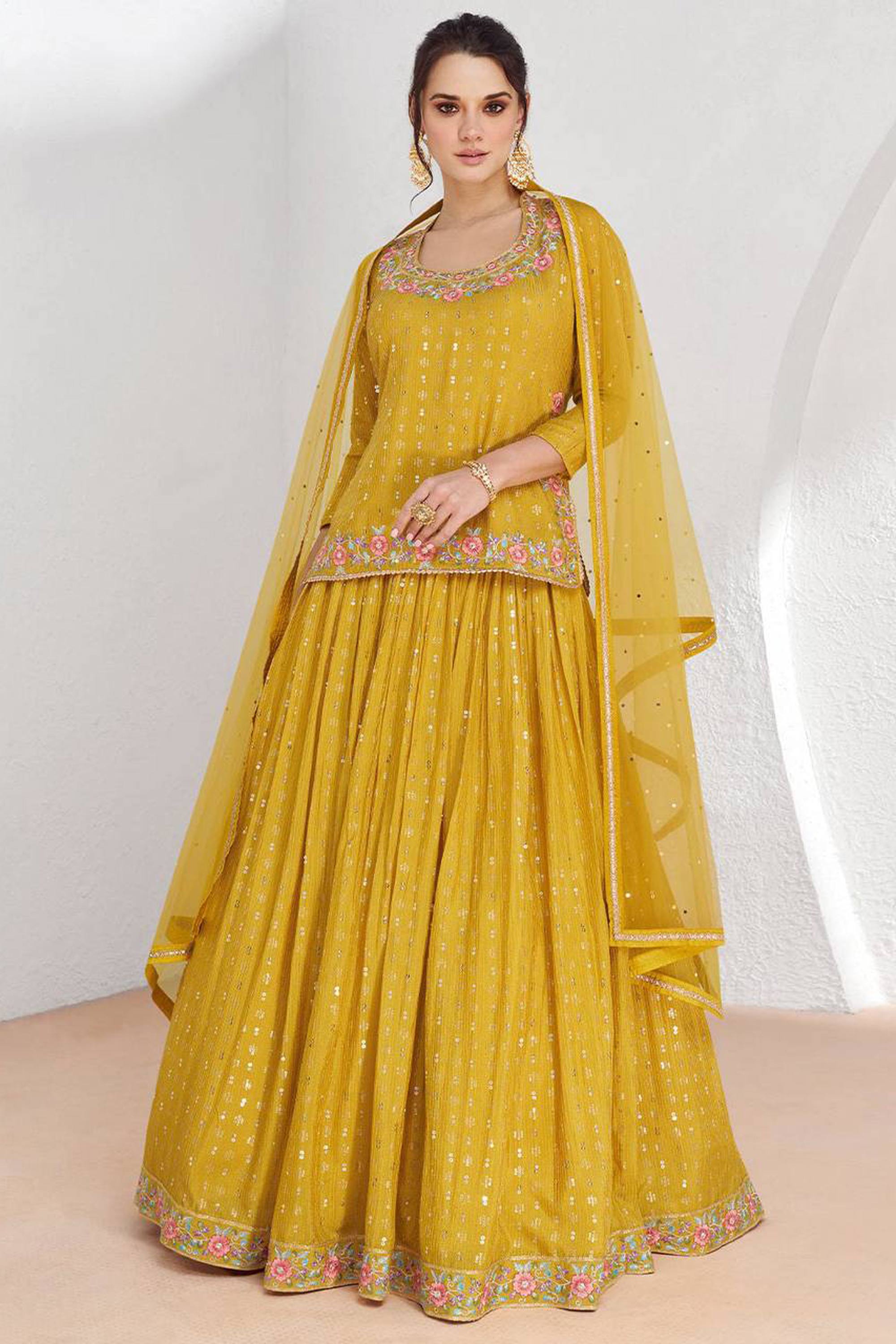 Chinon Embroidered Mustard Sangeet Wear Lehenga Choli
