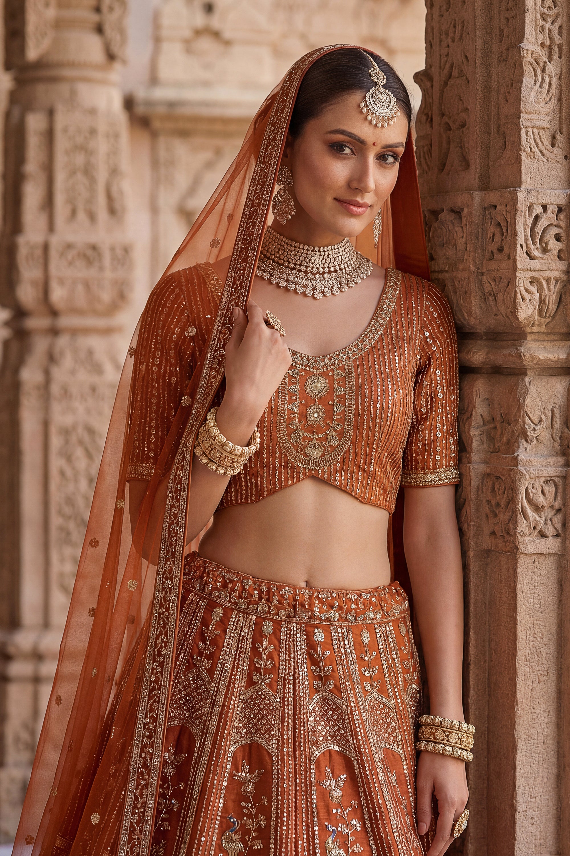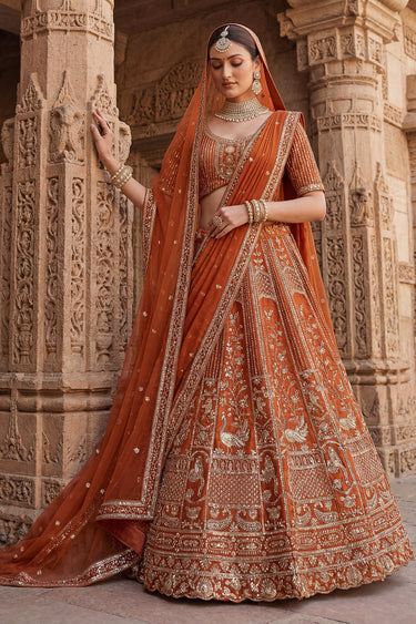 Luxury Heavy Embroidery Bridal Look Orange Designer Silk Lehenga Choli