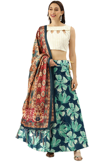 Teal Color Printed Work On Satin Silk Fabric Beatific Lehenga