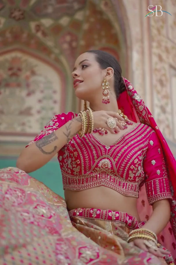 Step into your wedding day with the timeless elegance of our Bridal Banarasi Silk Lehenga. Crafted to exude luxury, this lehenga is made from rich Banarasi silk, known for its exquisite texture and royal charm. The blouse, made from smooth silk, pairs beautifully with the lehenga, enhancing the sophisticated allure. Completing the ensemble, a pure viscose dupatta cascades gracefully, adding an ethereal touch to your bridal look. Intricate embroidery work adorns each piece, creating a captivating, handcrafted finish that catches every eye. Perfect for wedding wear, this lehenga is designed to make you the star of your special day. Please note: colors may vary slightly due to digital imaging, and accessories shown are styled for display only.