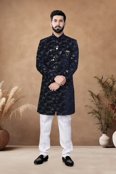 Blue Velvet Wedding Wear Trendy Readymade Indo Western For Men Set