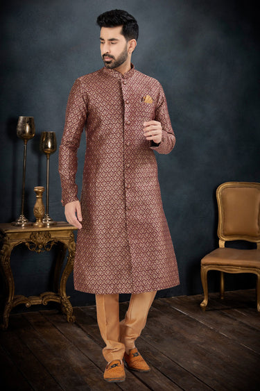 Wine Stunning Banarasi Jacquard Fabric Wedding Wear Readymade Indo Western Suit For Men