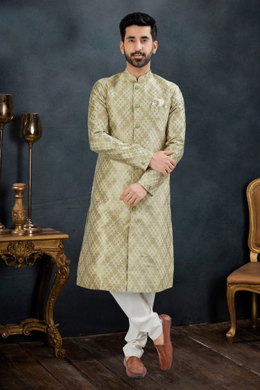 Appealing Sea Green Color Banarasi Jacquard Fabric Wedding Wear Readymade Indo Western Suit For Men