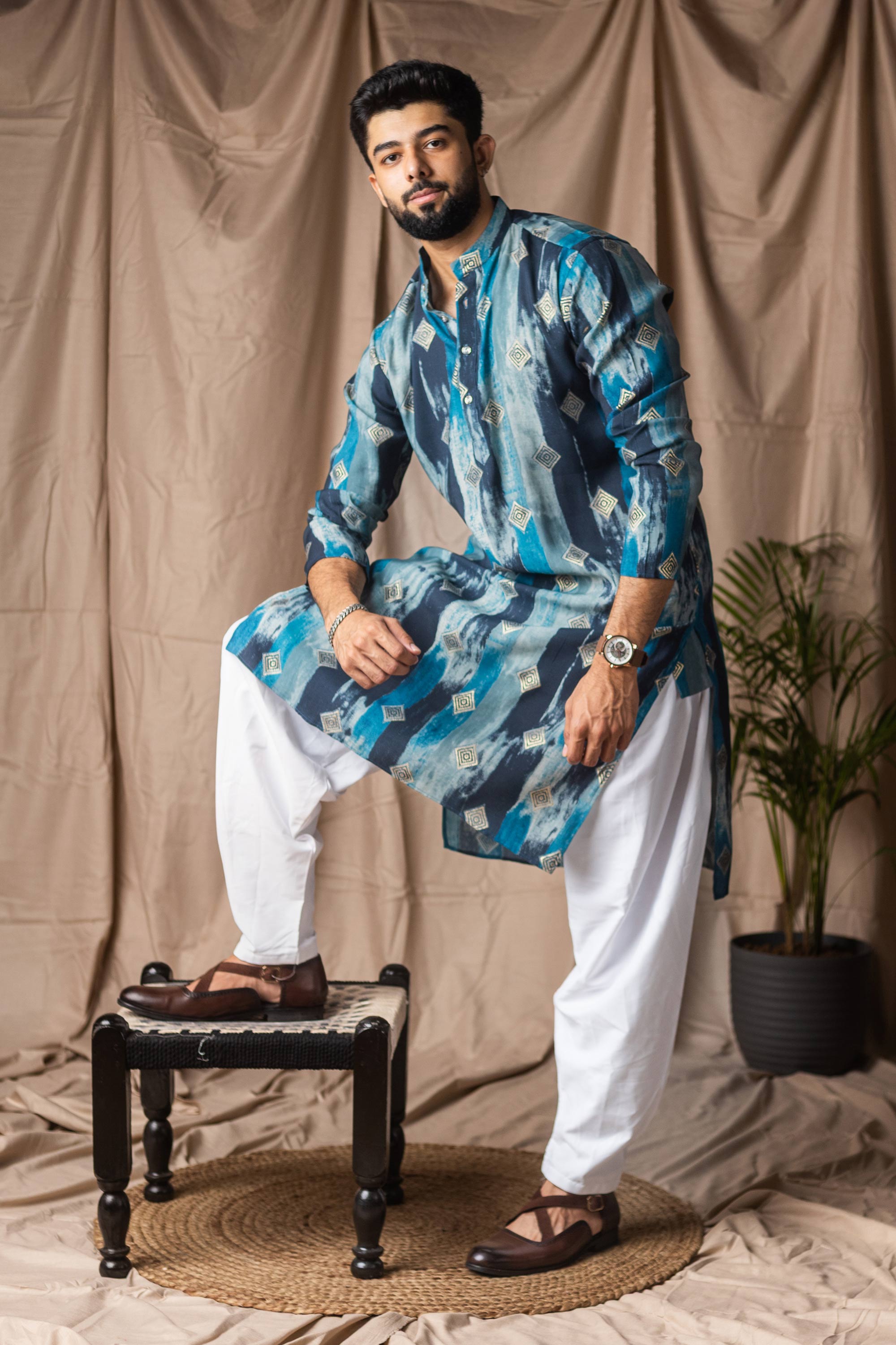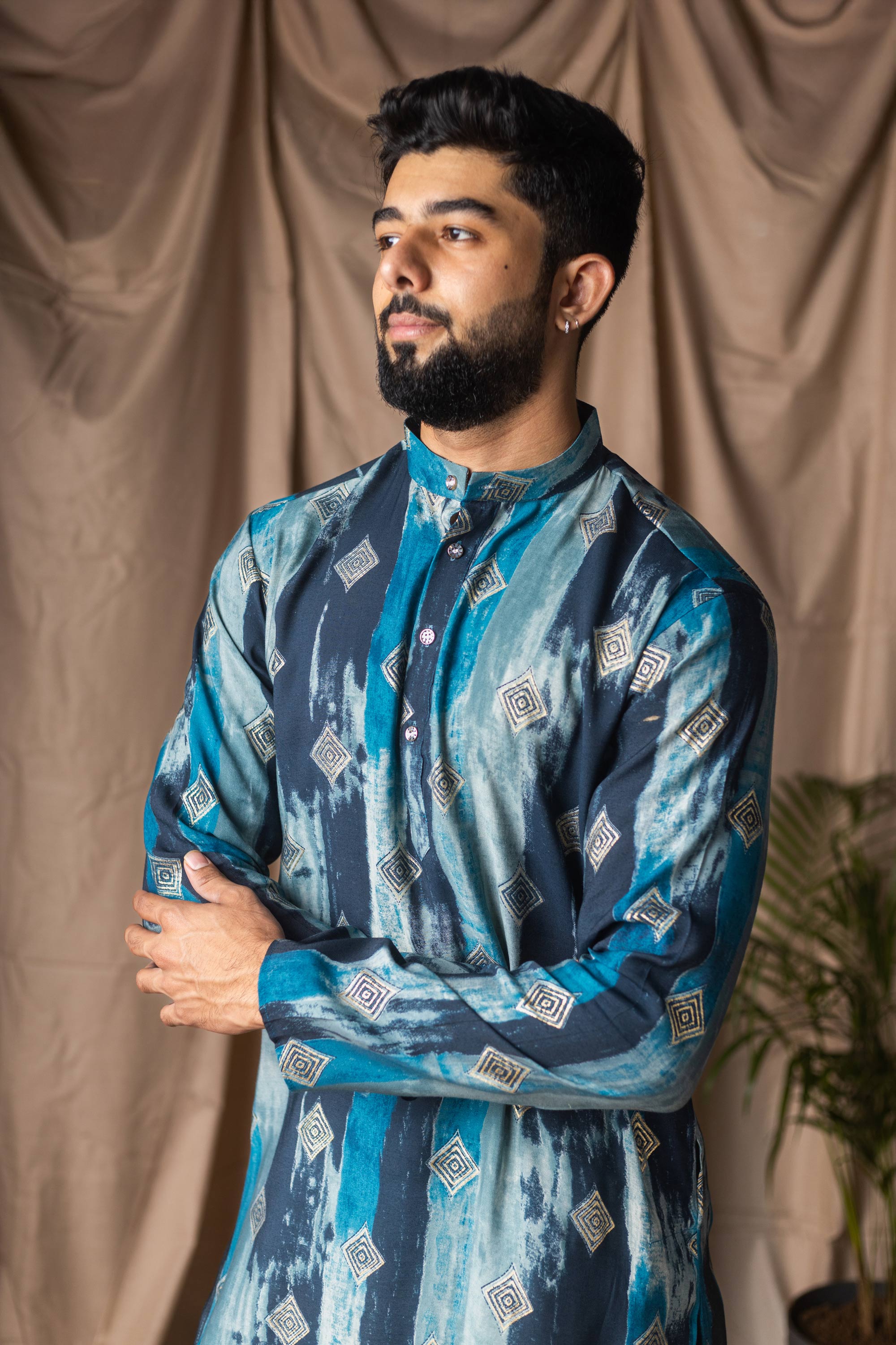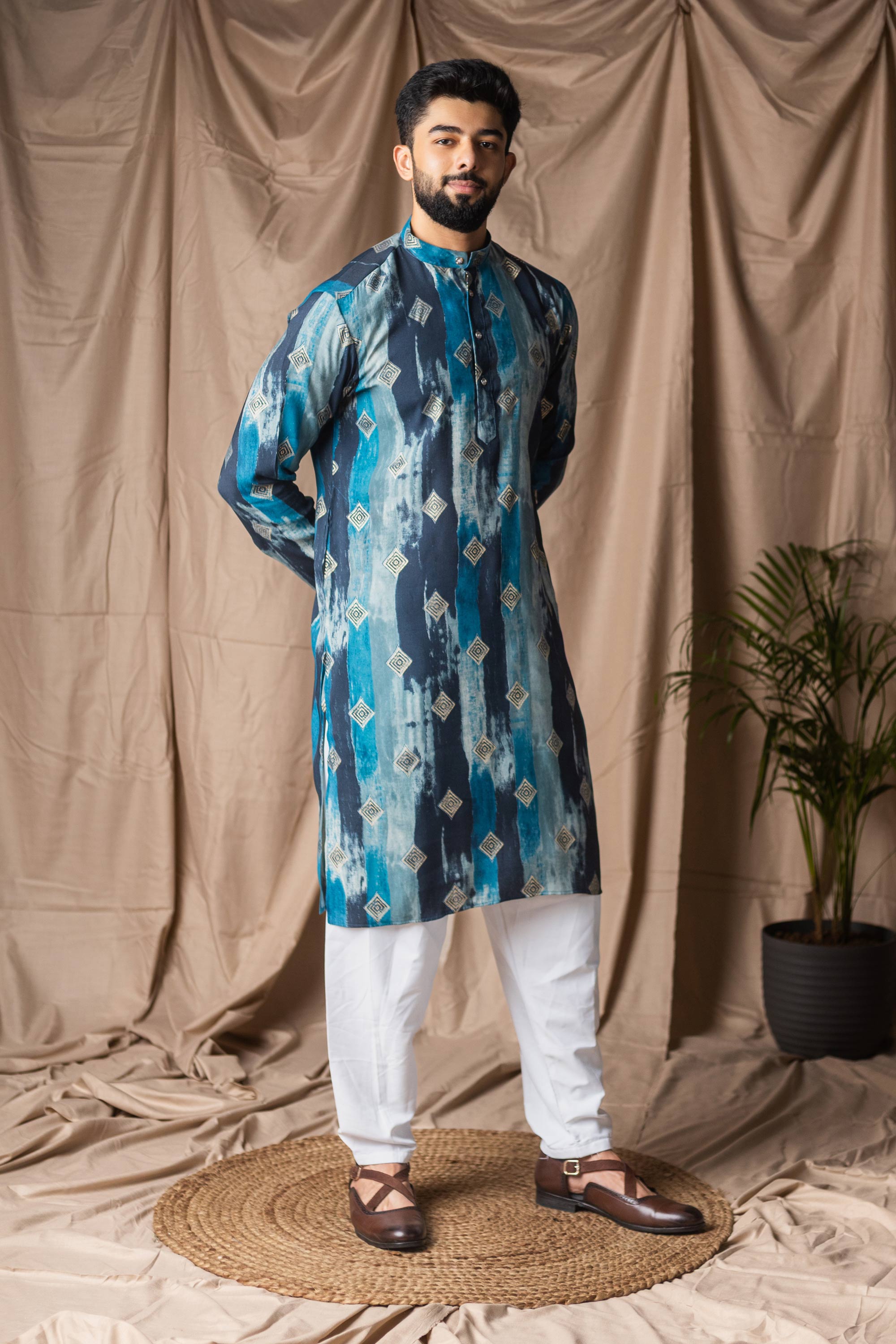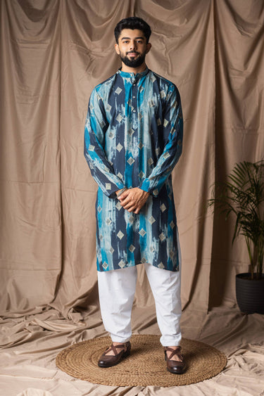 Art Silk Printed Blue Men Readymade Kurta Pyjama For Festive Wear