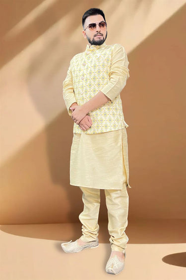 Attractive Function Wear Cream Kurta Pyjama With Yellow Color Jacket In Silk Fabric