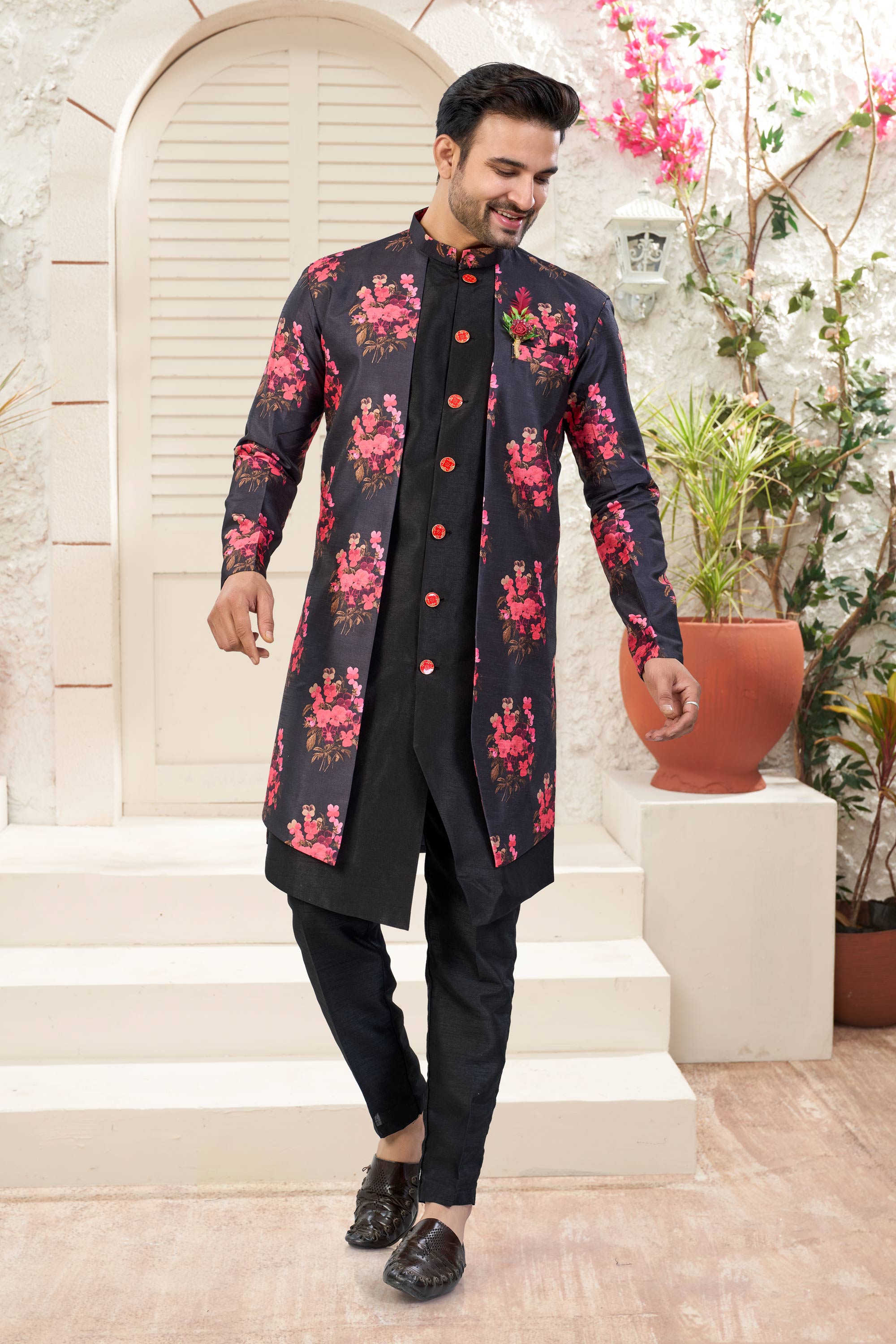 Black Wedding Wear Banarasi Silk Fabric Readymade Indo Western For Men