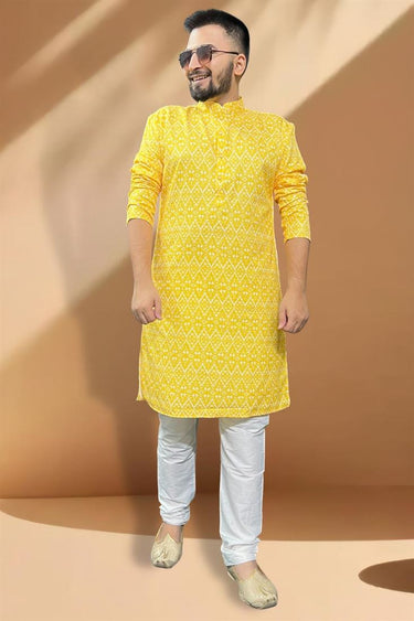 Cotton Fabric Function Wear Yellow Kurta Pyjama For Men