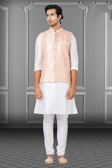 Dhupion Raw Silk Fabric White Festive Wear Readymade Stunning Kurta Pyjama For Men With 3 Pcs Jacket Set