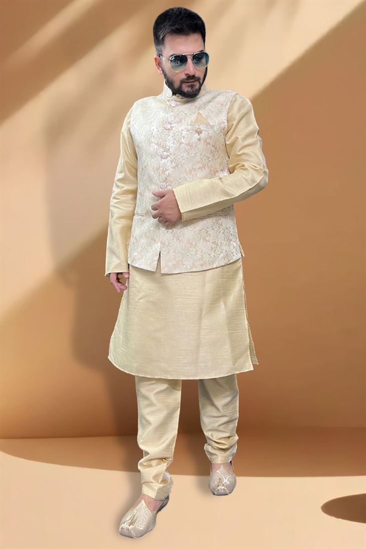 Enriching Beige Color Silk Fabric Kurta Churidar With Jacket