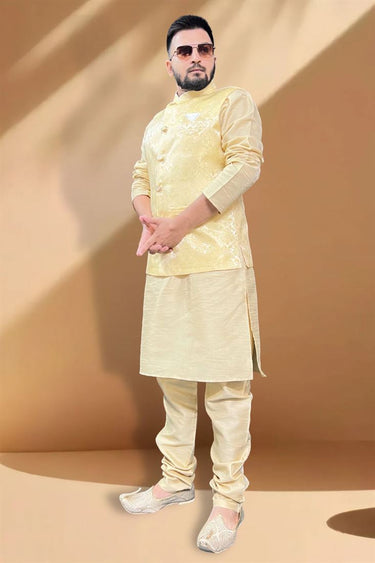Enriching Function Wear Silk Fabric Cream Kurta Pyjama With Yellow Color Jacket