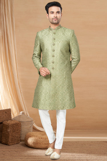 Green Color Fancy Fabric Designer Readymade Indo Western For Men