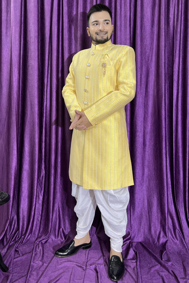 Jacquard Fabric Yellow Color Designer Readymade Peshawari Style Indo Western For Men