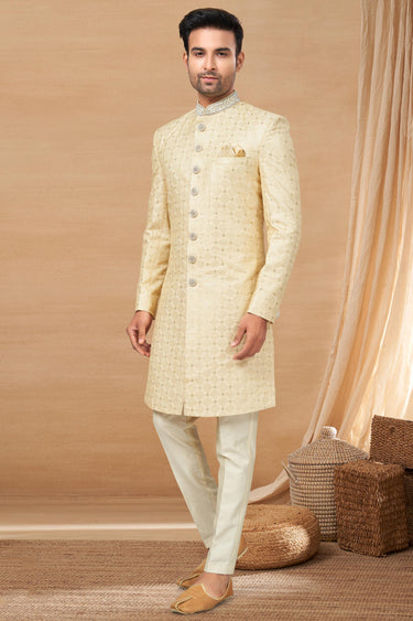 Elevate your style quotient with our readymade Indo Western outfit for men. Tailored from high-quality fabric, this suit showcases a perfect blend of Indian and Western fashion. It includes a cream-colored waistcoat with exquisite embroidery detailing, coupled with matching trousers and a chic maroon kurta. The full ensemble radiates elegance and is ideal for festive occasions or traditional ceremonies. The outfit is available in various sizes, ensuring a perfect fit for all.