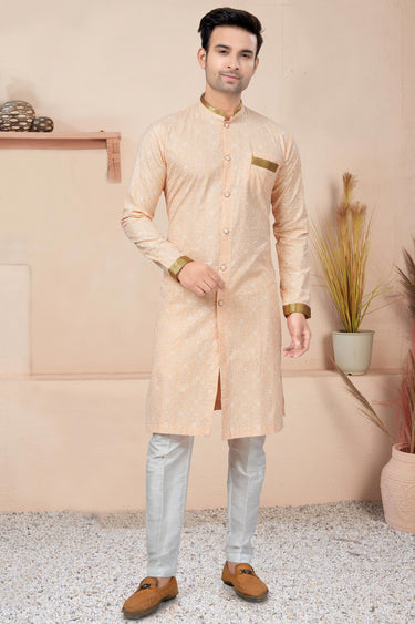 Printed Readymade Indo Western For Men In Cotton Peach Color