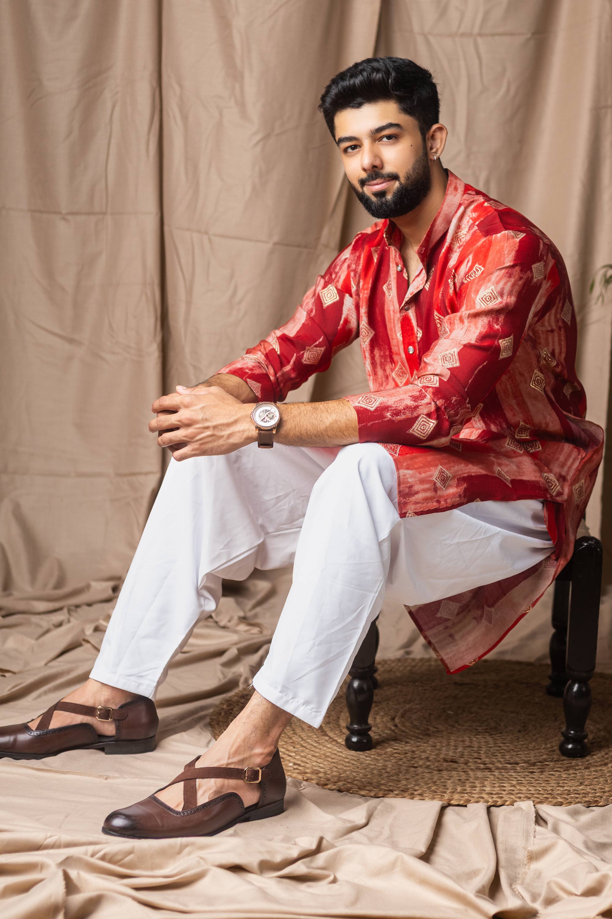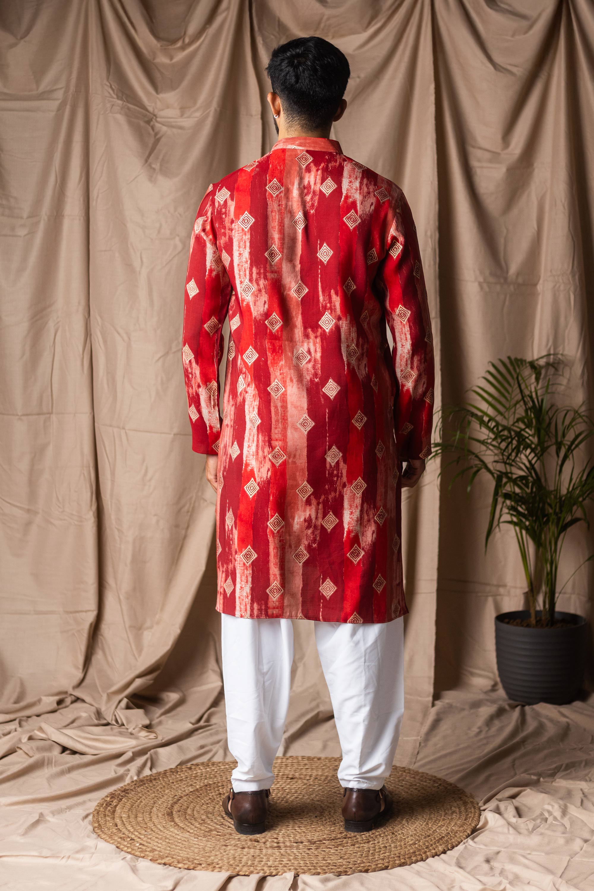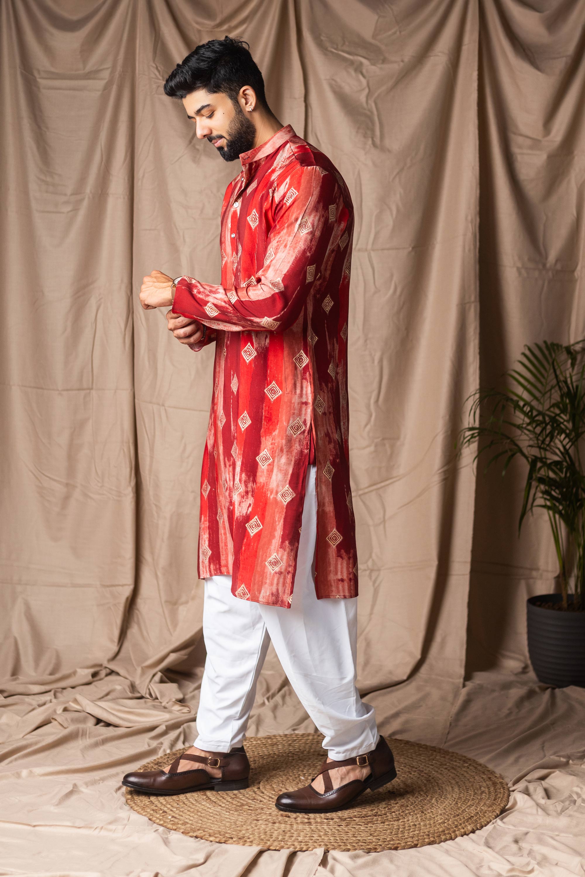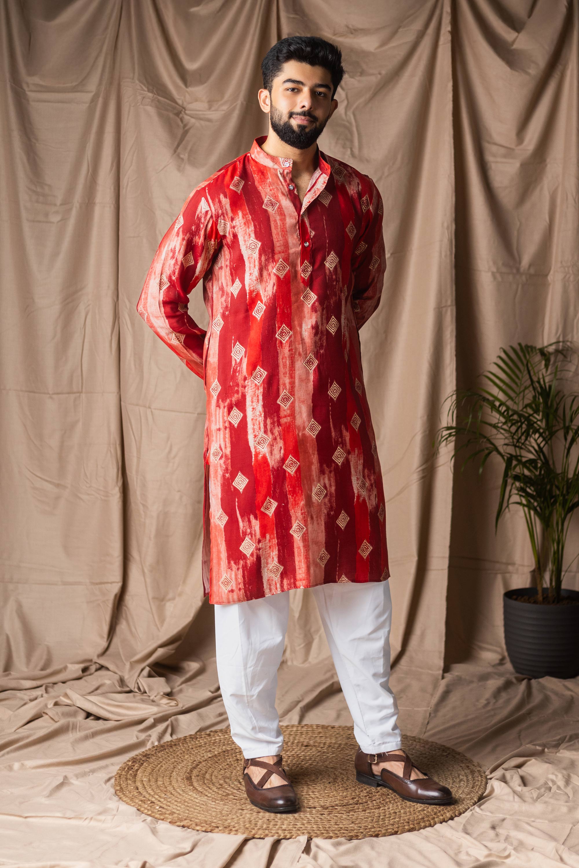 This stylish Readymade Mens Kurta Pyjama combines traditional design with modern comfort. Crafted from art silk fabric for the kurta and paired with a soft cotton bottom, it delivers a refined look. Finished with attractive print detailing and a rich festive color, this set is perfect for festivals, functions, and special occasions. Note: Due to digital photography, slight color variations may occur.