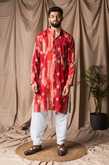 Red Festive Wear Art Silk Printed Readymade Kurta Pyjama For Men