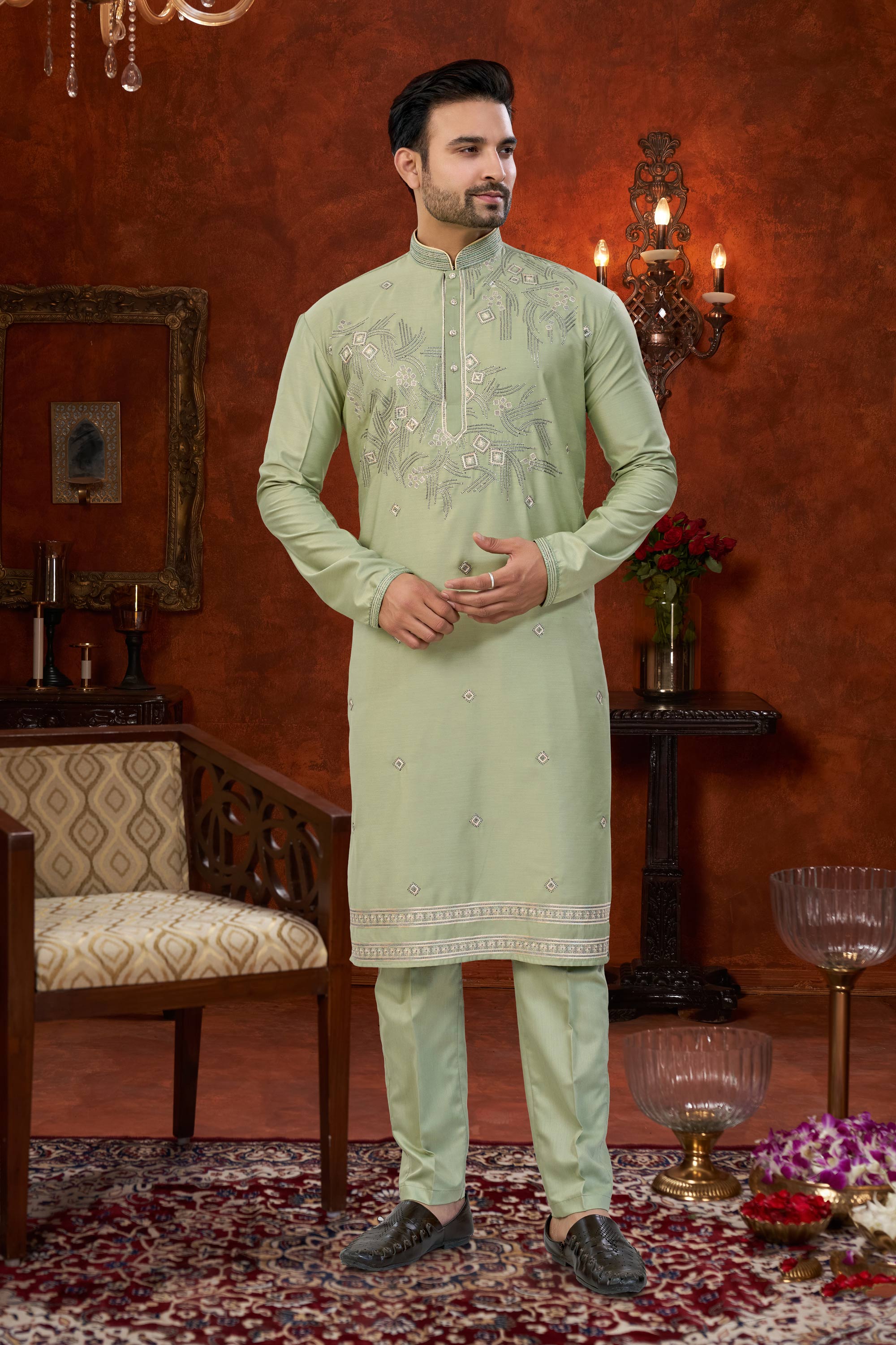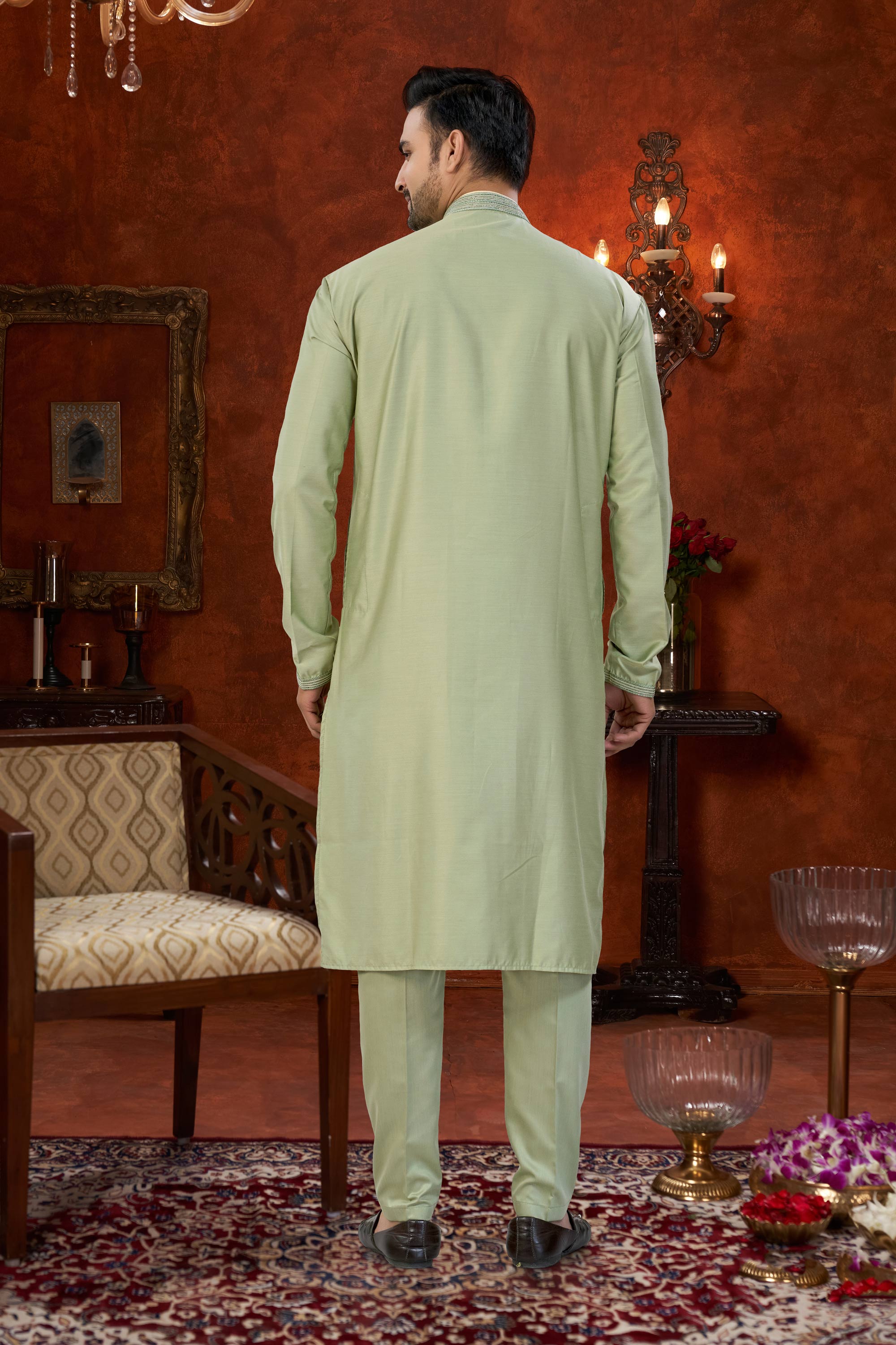 Add grace to your traditional wardrobe with this Mens Kurta Pyjama made from premium Art Silk. The Dhupion Silk pyjama bottom ensures comfort and a polished appearance. Its rich color makes it perfect for weddings and festive events. Slight color variation may occur due to digital photography.