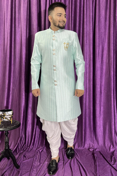 Sky Blue Color Jacquard Fabric Wedding Wear Readymade Designer Peshawari Style Indo Western For Men
