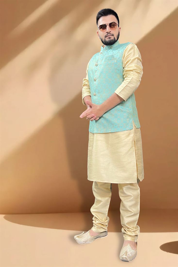 Splendiferous Silk Fabric Function Wear Cream Kurta Pyjama With Light Cyan Color Jacket