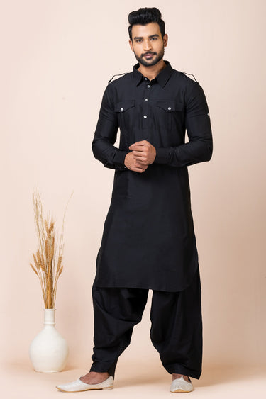 Stylish Viscose Fabric Black Color Pathani Kurta Pyjama Set For Function