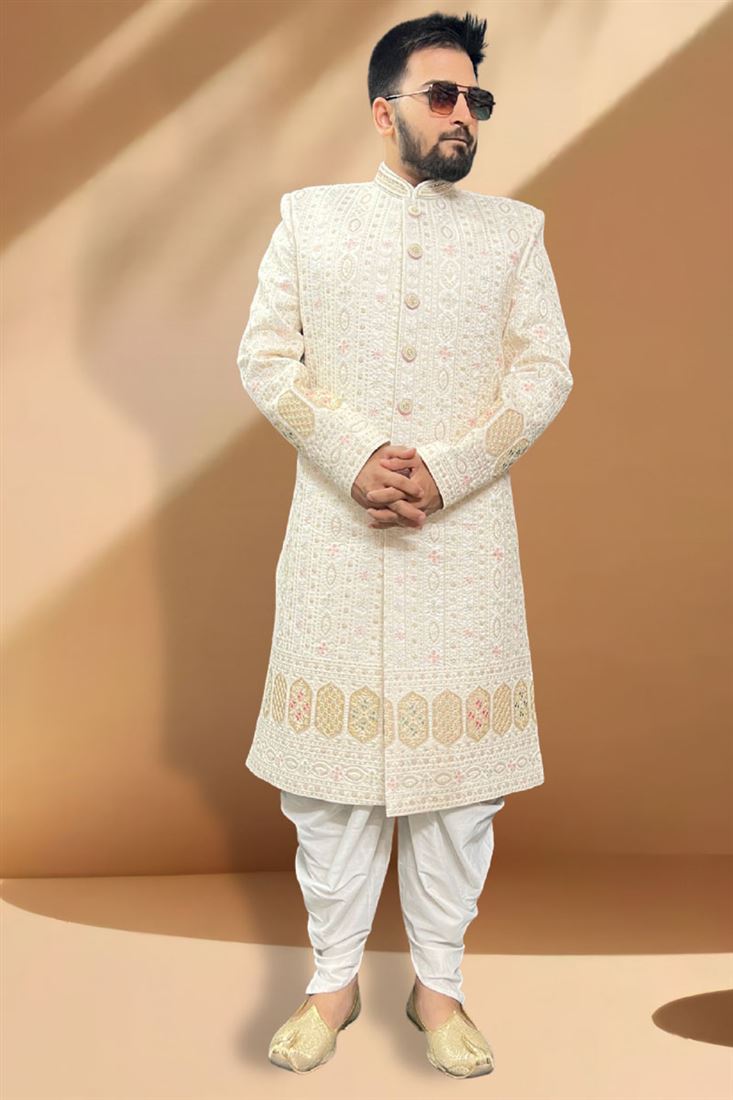 Vivacious Silk Fabric Peshawari Style Indo Western Set In Cream Color
