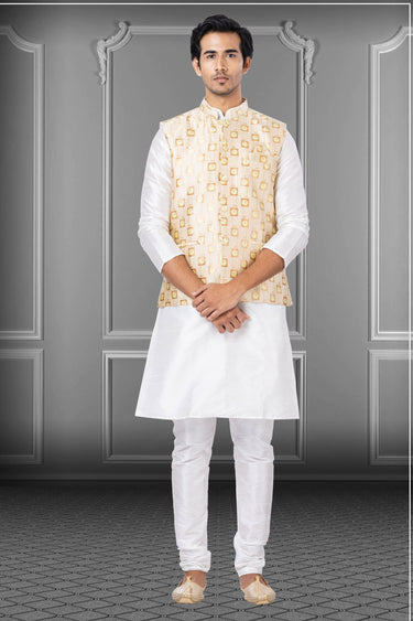 White Dhupion Raw Silk Fabric Sangeet Wear Readymade Kurta Pyjama For Men With Jacket
